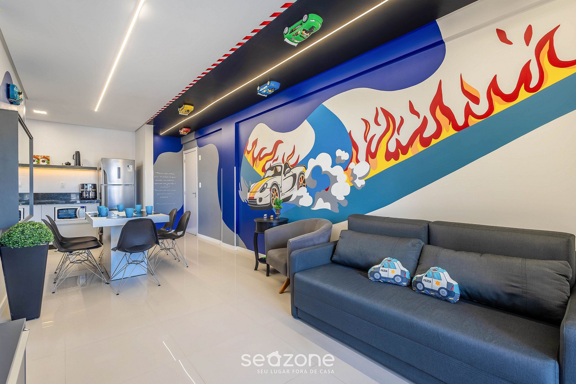 ¡Vive la emoción de hospedarte en un apto de coches! Con suite con cama matrimonial, habitación temática climatizada, sala de estar acogedora, cocina totalmente equipada y balcón con parrilla gourmet, este inmueble ofrece la combinación perfecta de confort y diversión. A solo 600m de la Playa de Armação e a 5 minutos caminando de Beto Carrero World. ¡Todo para hacer que tu estadía sea inolvidable!