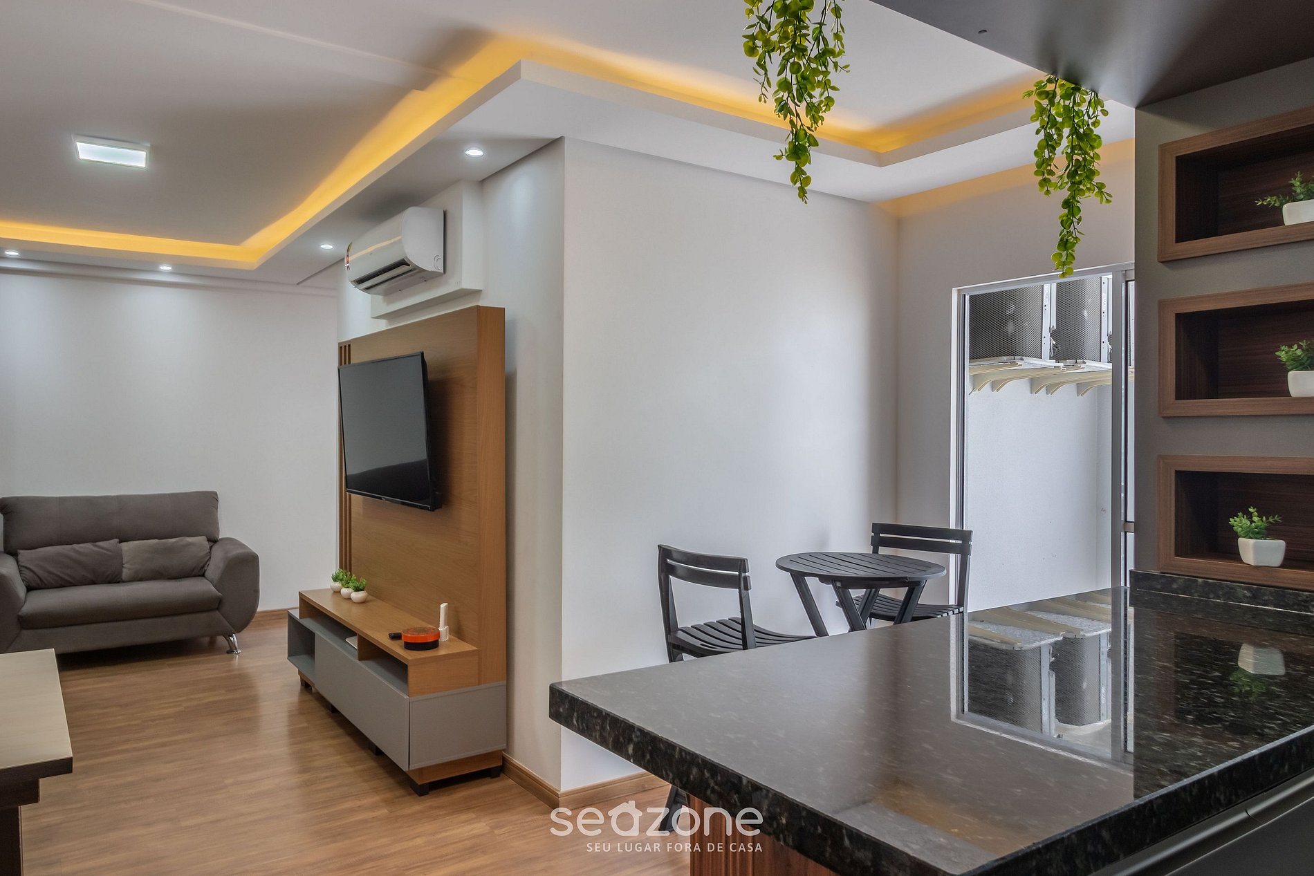 - Sala de estar con sofá, Smart TV y aire acondicionado;