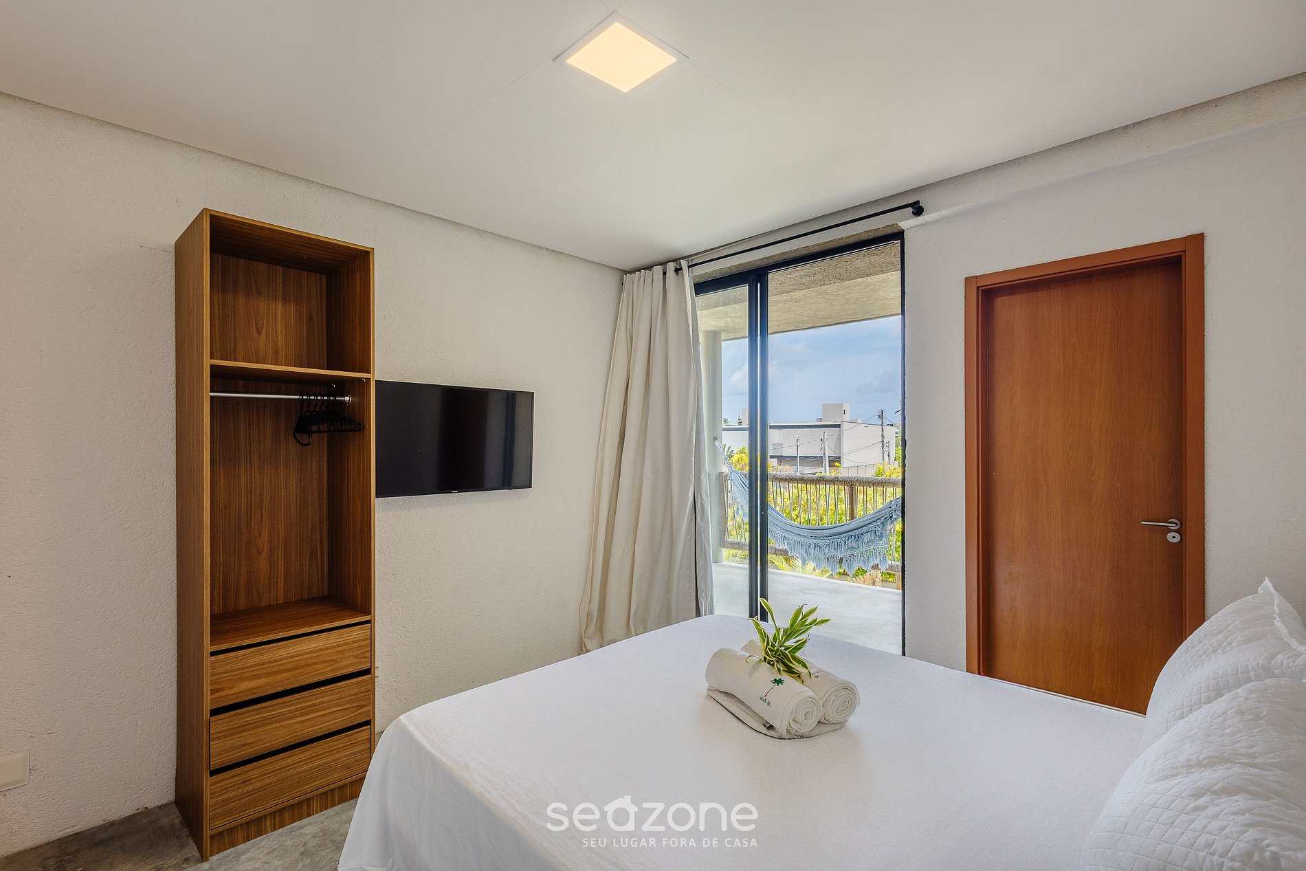 - 1 suite con cama doble, cama individual adicional, Smart TV, perchero, balcón con hamaca, cortinas opacas y aire acondicionado;