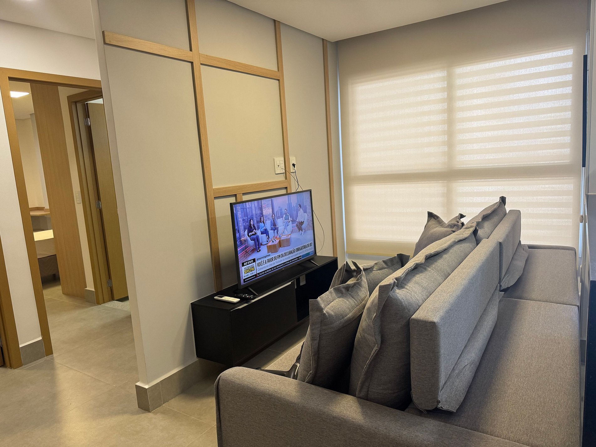 - Sala de estar con sofá, Smart TV y aire acondicionado;