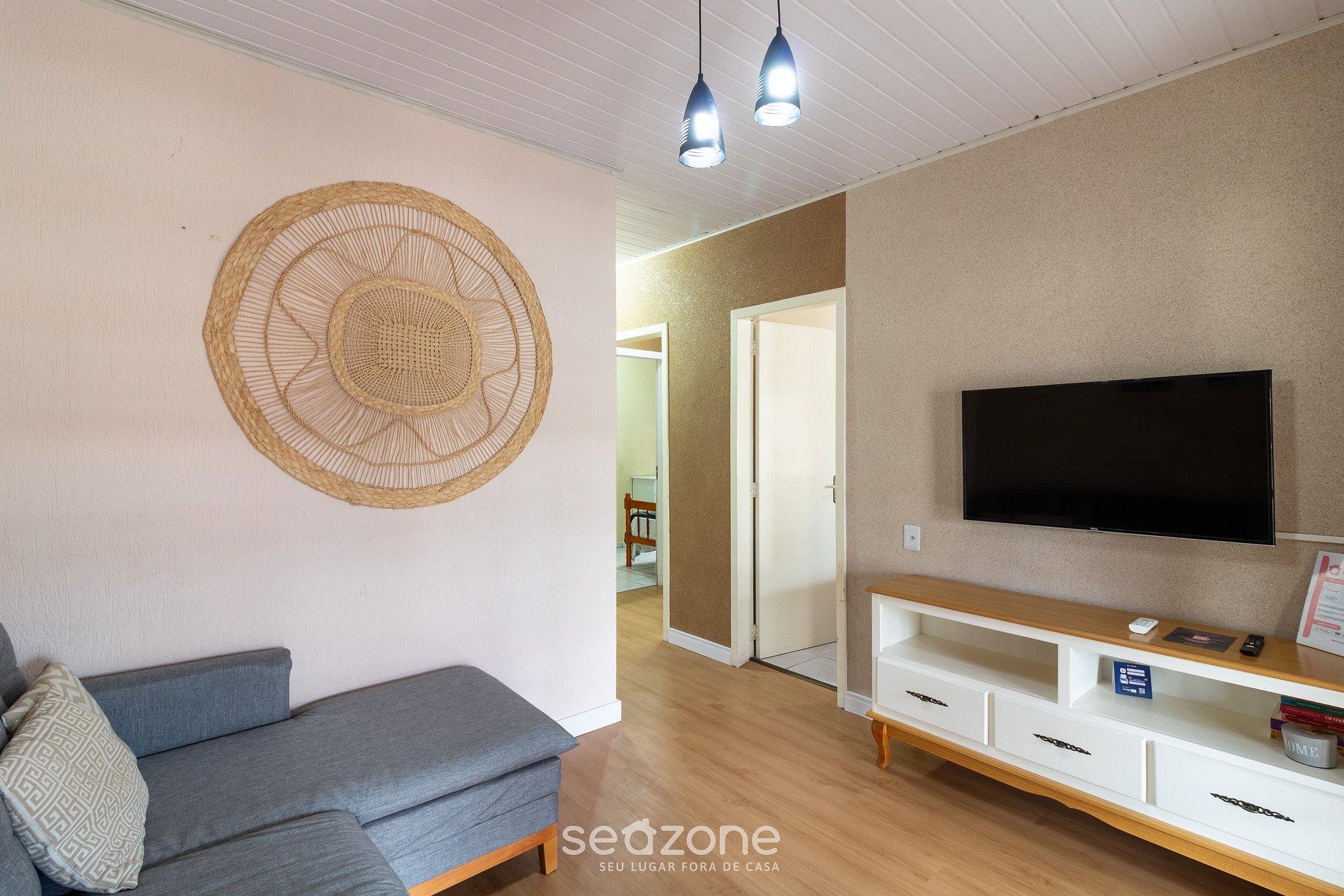 - Sala de estar con sofá, Smart TV y ventilador portátil;