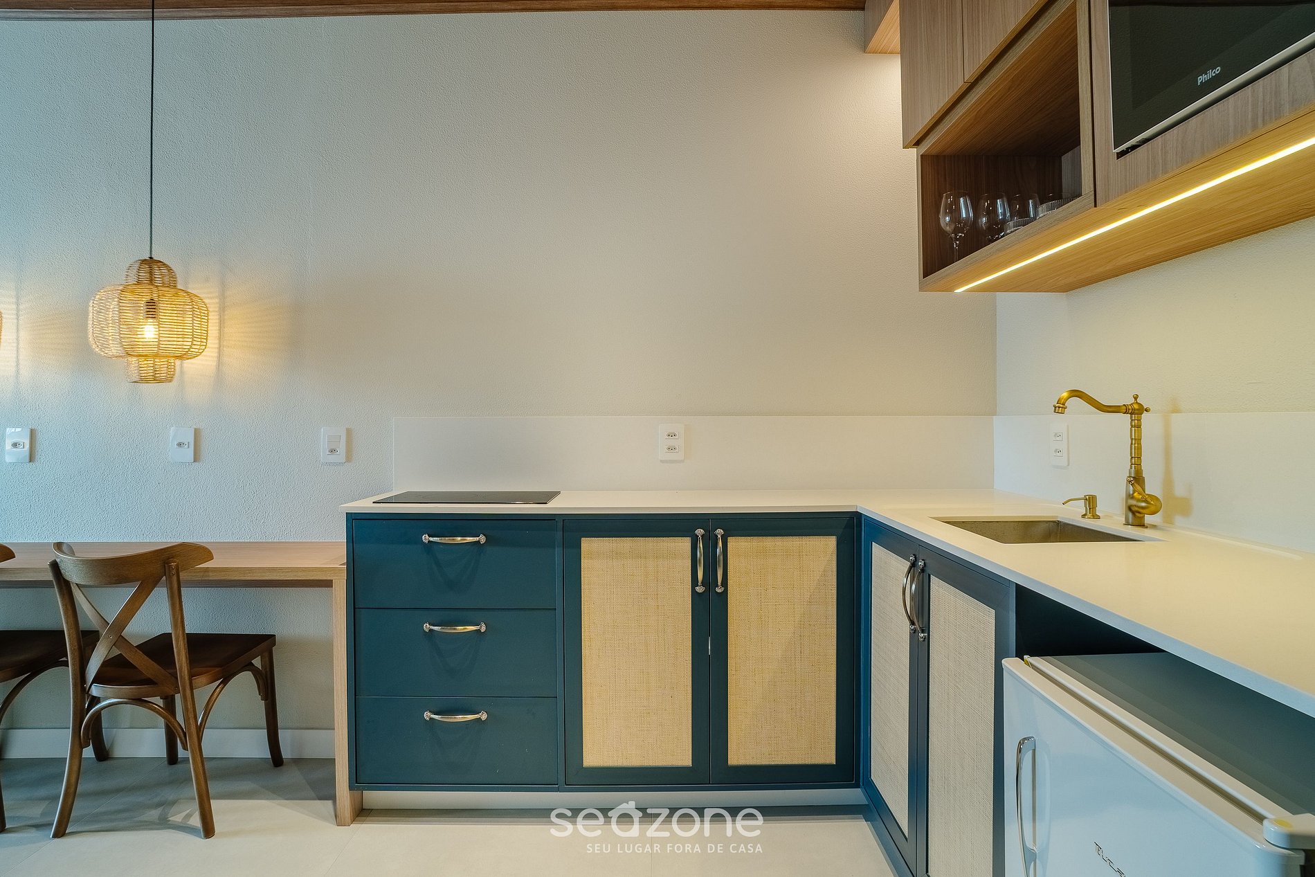 - Cocina con mininevera, placa de inducción, microondas, sandwichera, cafetera eléctrica, hervidor eléctrico, licuadora, copas de vino, ollas, sartenes, platos y utensilios;
