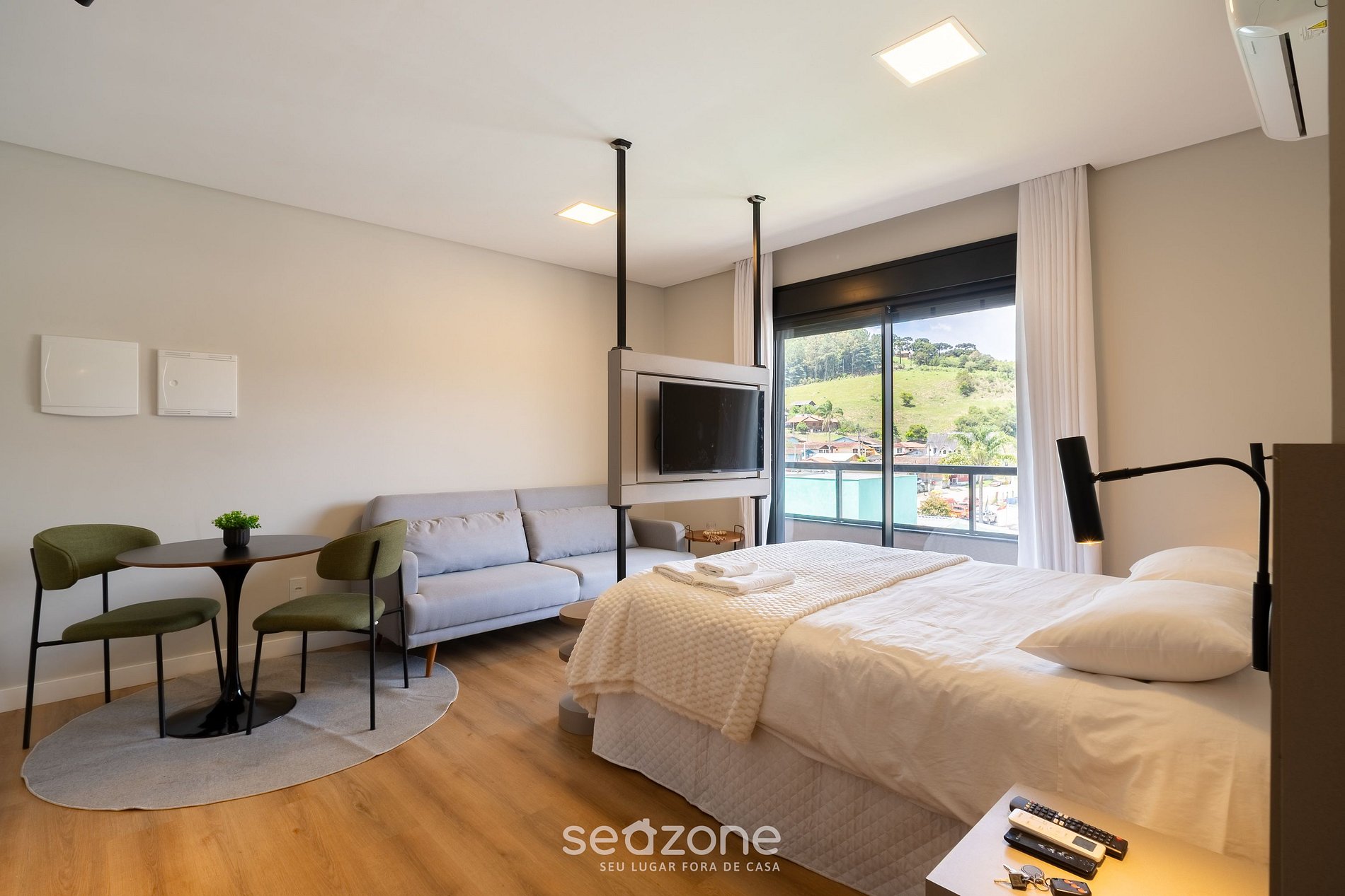 - 1 cama queen-size, sofá cama individual, armario, Smart TV y aire acondicionado;