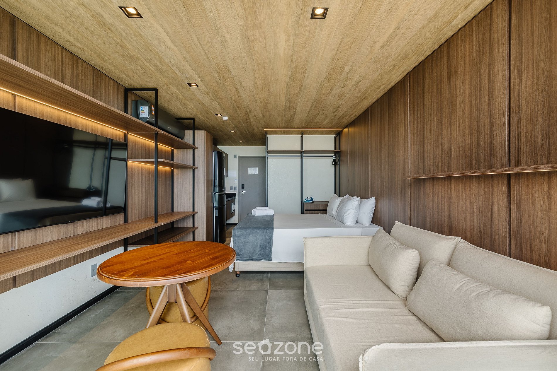 Este estudio moderno en Pajuçara combina elegancia y practicidad. Equipado con cama queen, aire acondicionado, Smart TV y cocina completa, ofrece máximo confort. El balcón con vista lateral al mar eleva la experiencia. El edificio cuenta con gimnasio, piscina en la azotea y áreas de ocio. Cerca del malecón, feria artesanal, restaurantes, mercado y salida a las piscinas naturales.