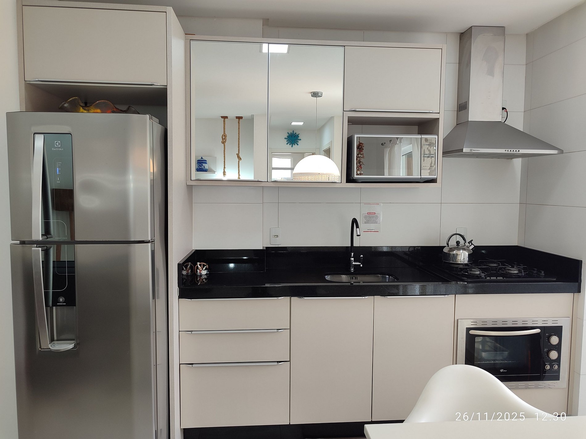 - Cocina totalmente equipada con refrigerador, placa de cocina (eléctrica), horno eléctrico, microondas, sandwichera, kit de café (portafiltro, termo), tetera, licuadora, copas de vino, ollas, platos y utensilios;
