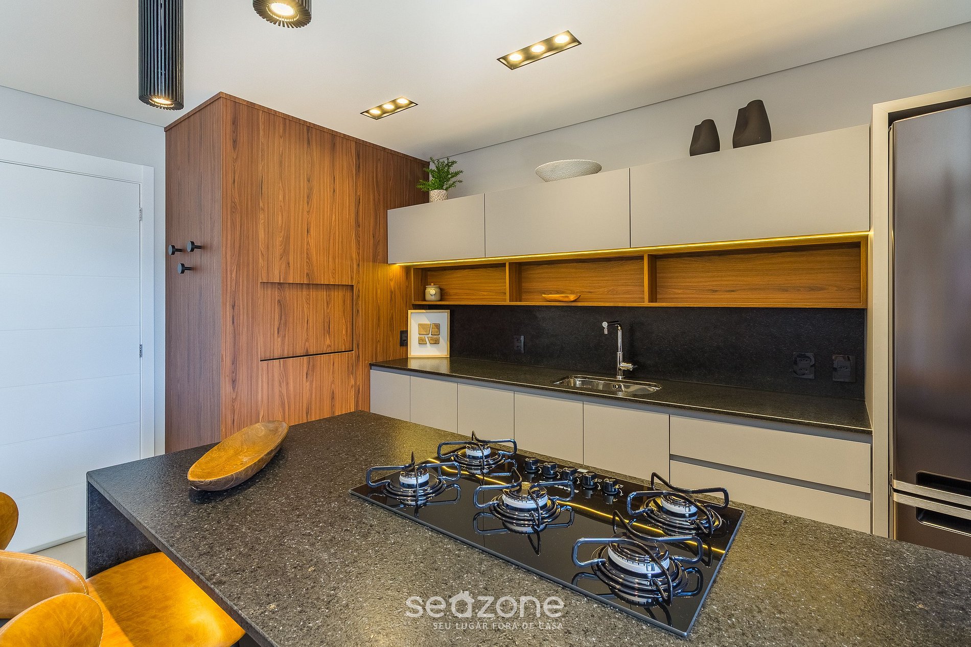 - Espacio con parrilla gourmet, bancada y taburetes;