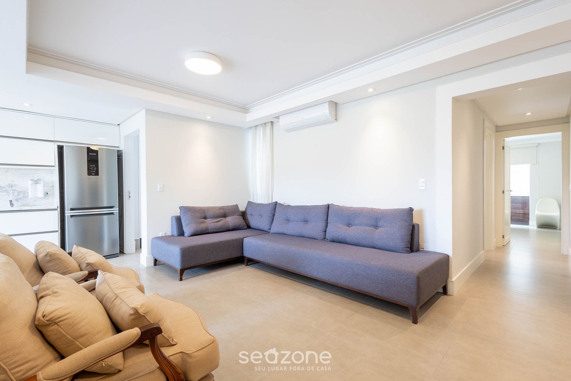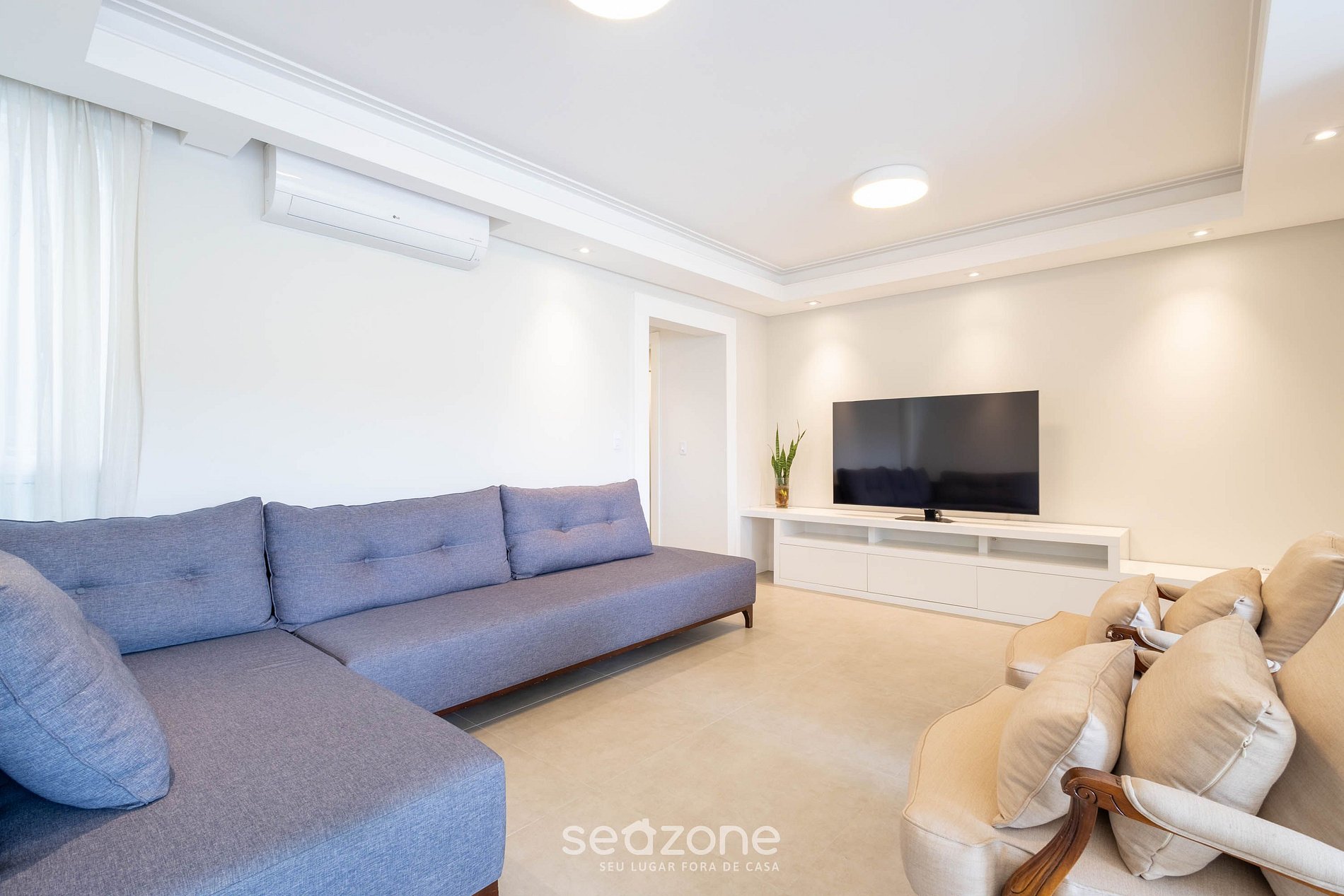 - Sala de estar con sofá, aire acondicionado y Smart TV;