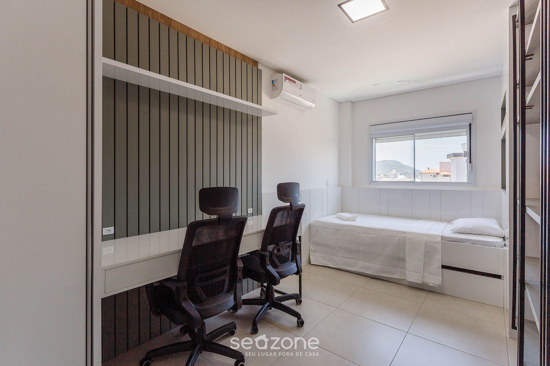 - 1 Dormitorio con 1 cama individual y cama auxiliar, espacio de trabajo y aire acondicionado;