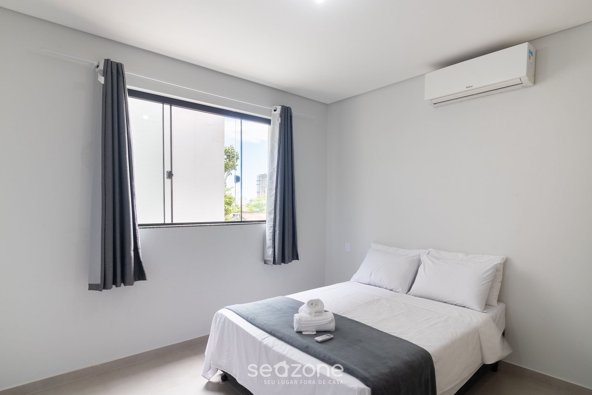 - 1 Dormitorio con cama doble, armario, cortinas opacas y ventilador portátil;