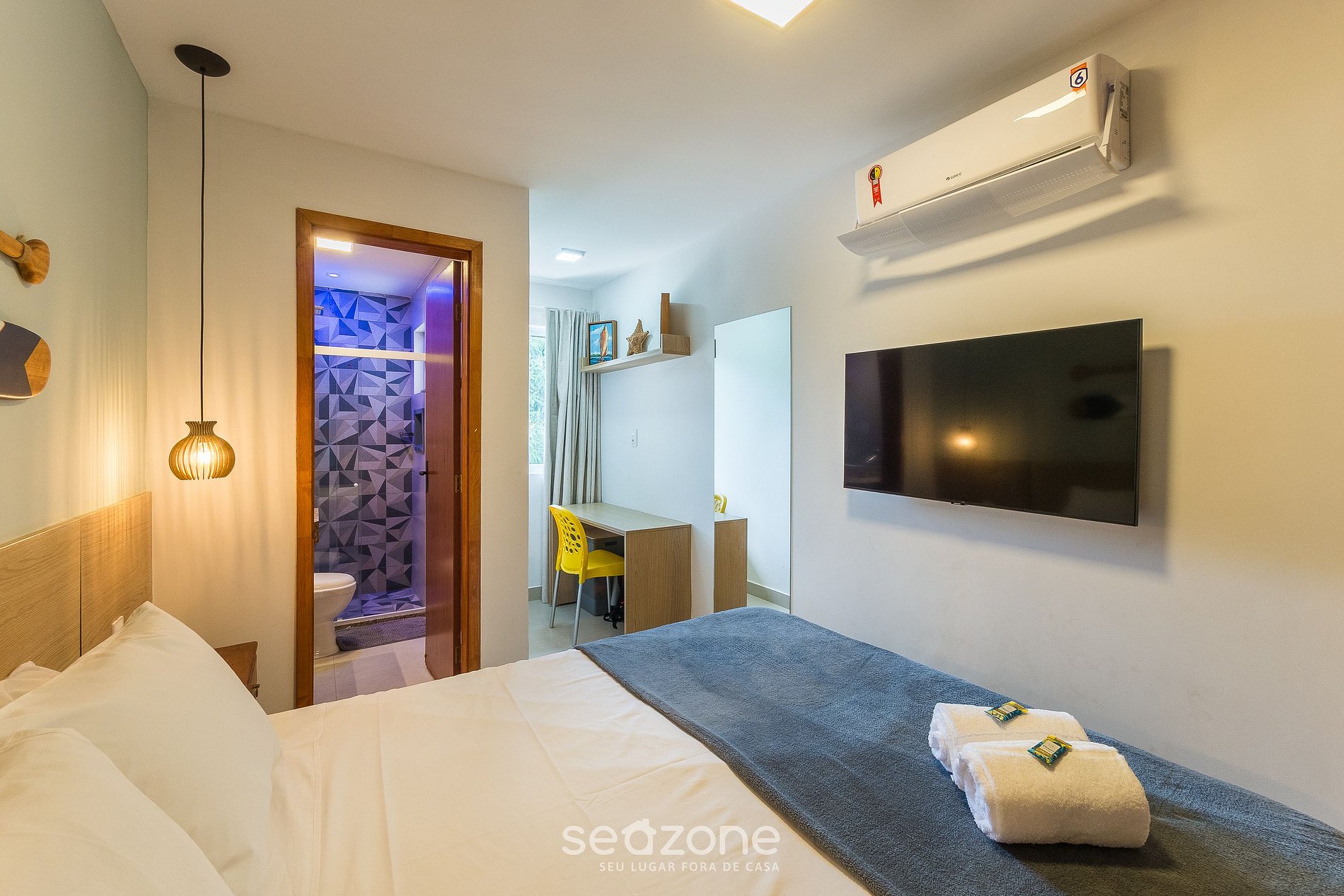 - 1 suite con cama matrimonial, Smart TV, armario, cortinas opacas y aire acondicionado;