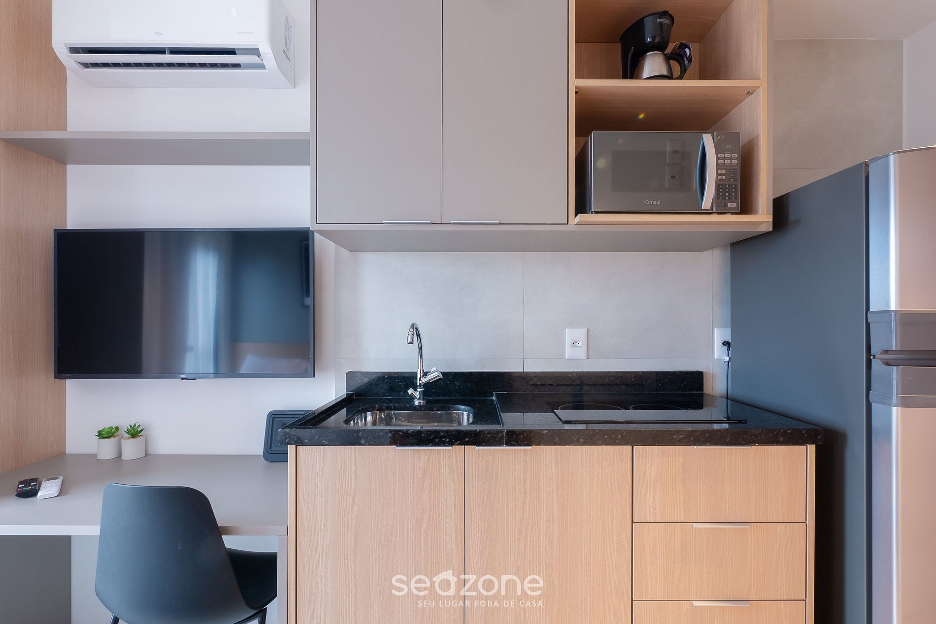 - Cocina completa con refrigerador, cocina de inducción (cooktop), microondas, sandwichera, licuadora, cafetera eléctrica, copas de vino, ollas, vajilla y utensilios;