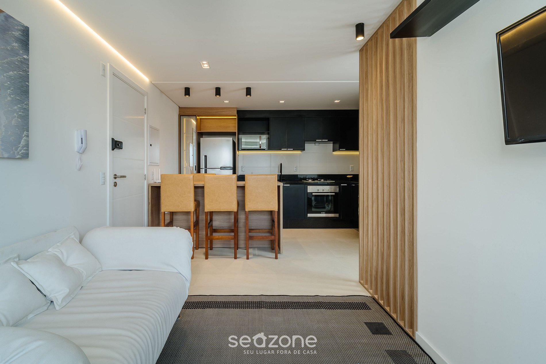 Moderno y acogedor, este estudio combina integración, buena iluminación y un diseño que destaca cada detalle. La cocina integrada se conecta con la sala climatizada con sofá y Smart TV, mientras el dormitorio ofrece una cama cómoda y armario espejado. La luz LED crea una atmósfera elegante y atractiva. A pocos minutos de la Beira-Mar, cafés, mercados y accesos al Centro, tu estadía se vuelve más ligera y conveniente.