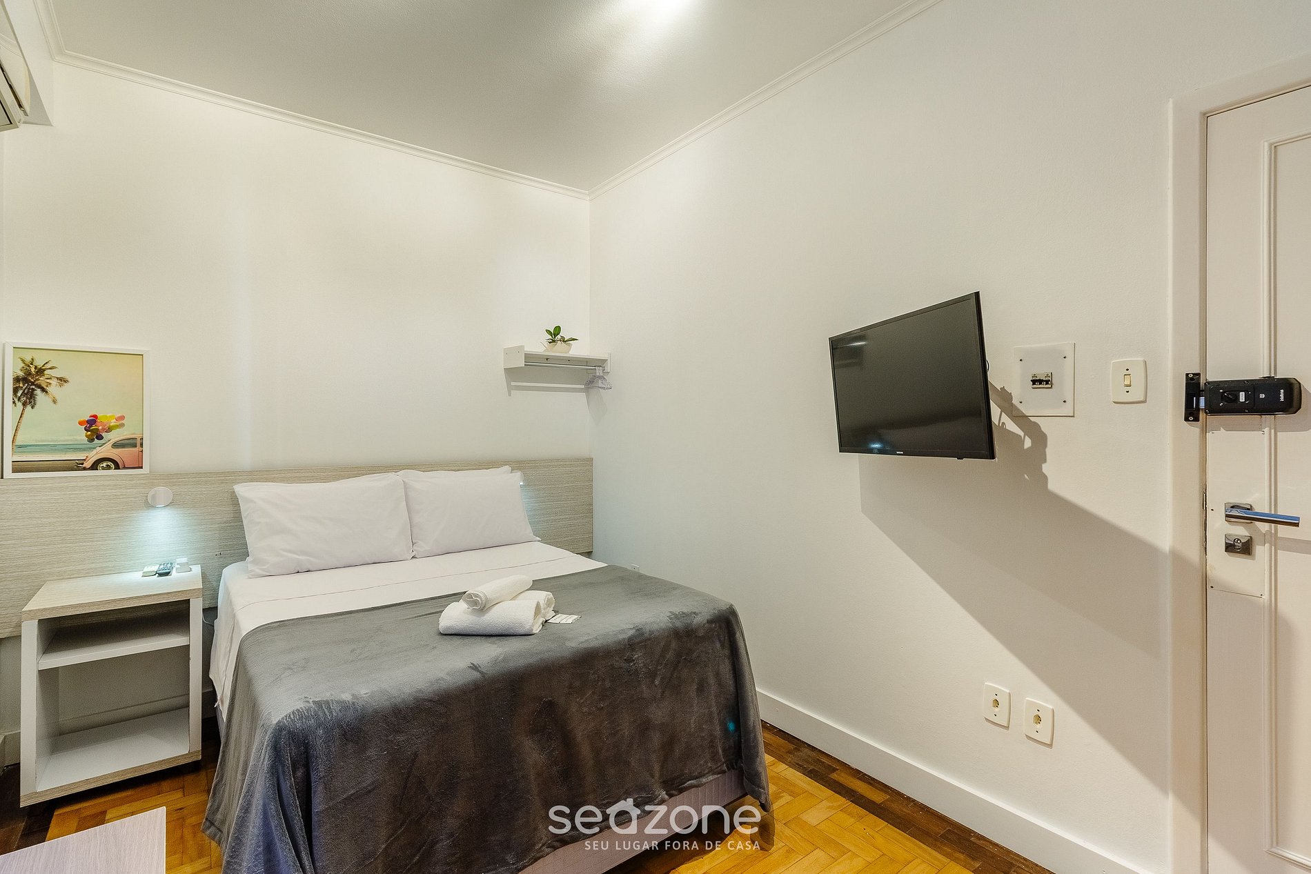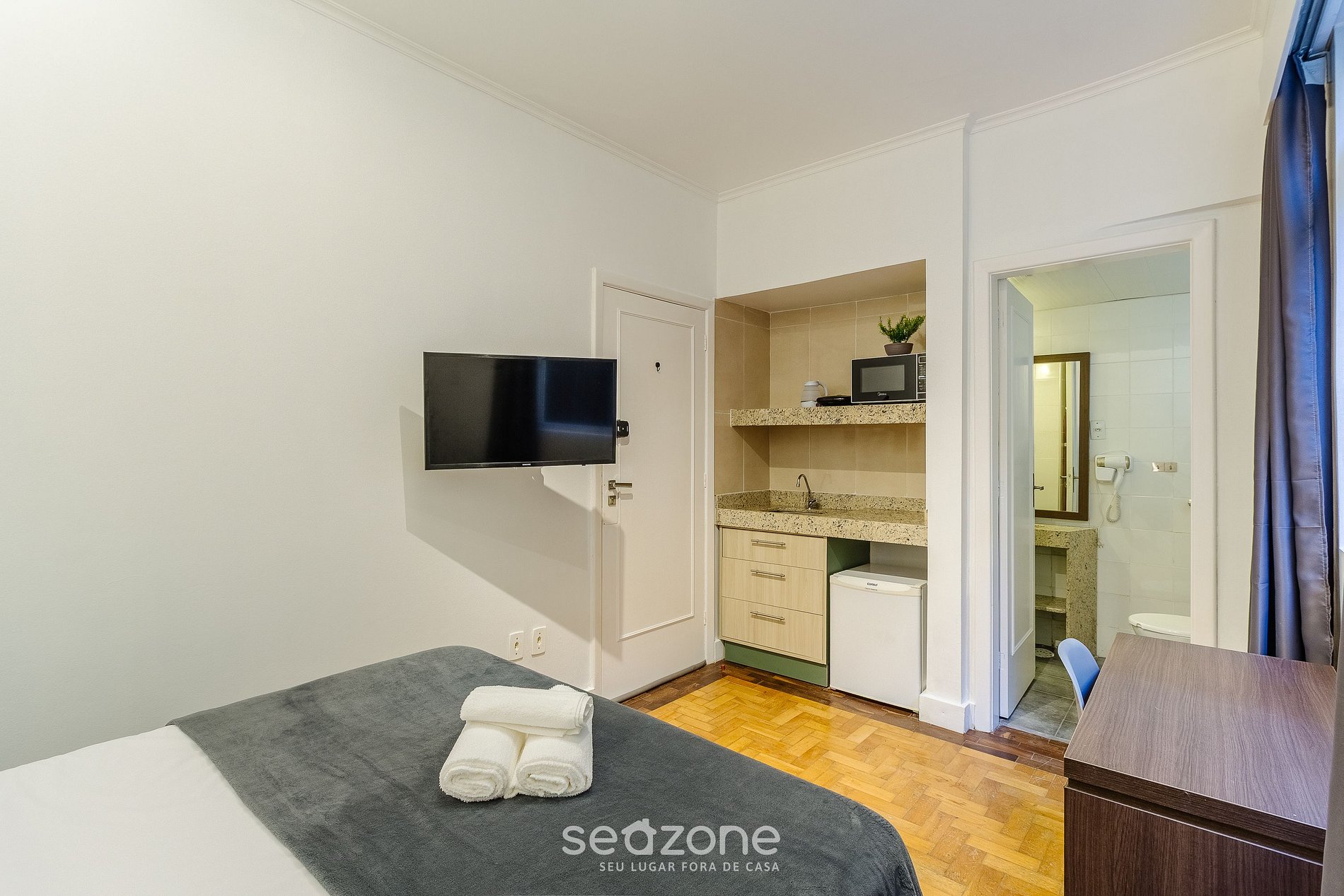 El estudio climatizado ofrece cama doble, Smart TV y cocina compacta con frigobar, microondas y cafetera. Las áreas comunes incluyen coworking, cocina compartida y salón de eventos. A pocos minutos del Mercado Público, la Casa de Cultura Mário Quintana y restaurantes tradicionales.