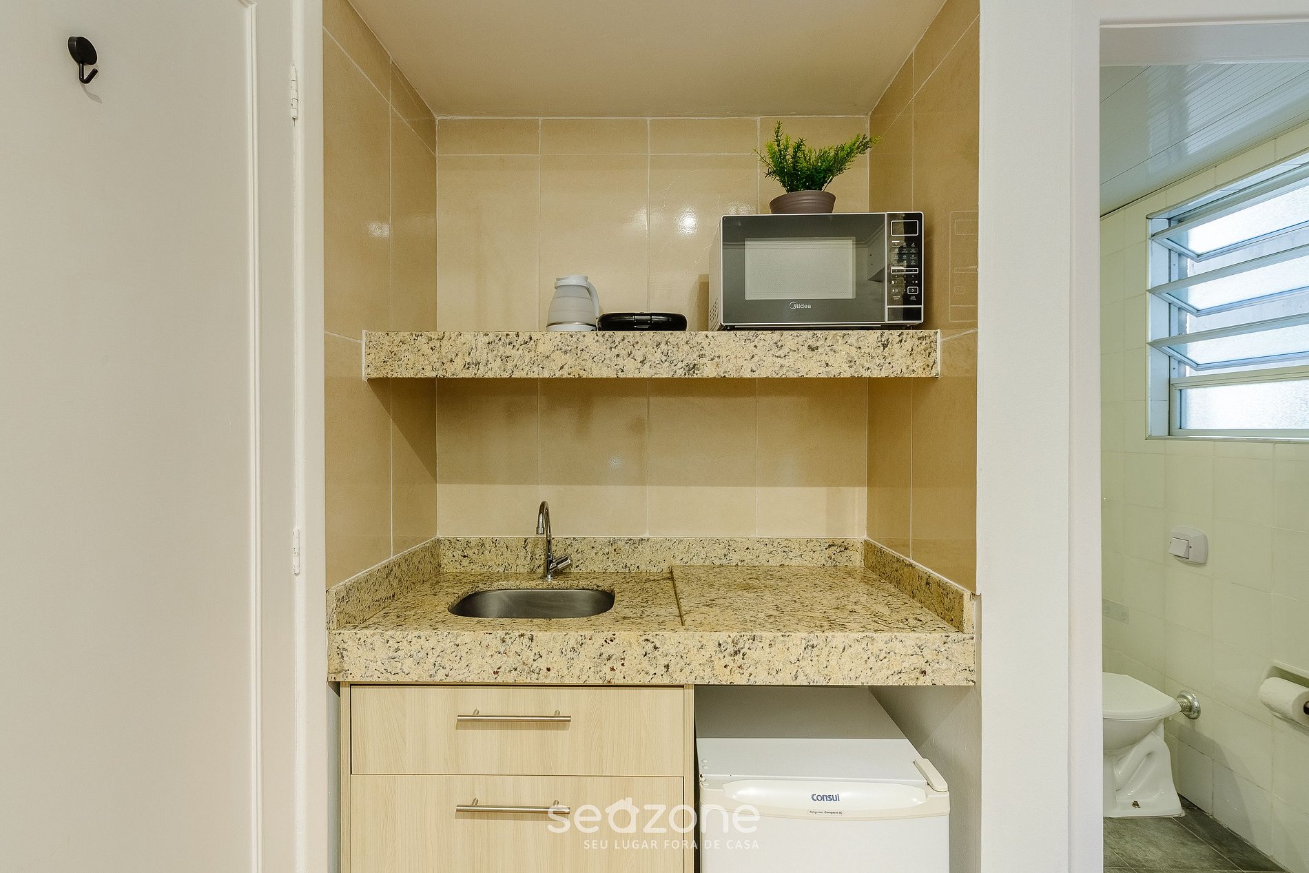 El estudio climatizado ofrece cama doble, Smart TV y cocina compacta con frigobar, microondas y cafetera. Las áreas comunes incluyen coworking, cocina compartida y salón de eventos. A pocos minutos del Mercado Público, la Casa de Cultura Mário Quintana y restaurantes tradicionales.