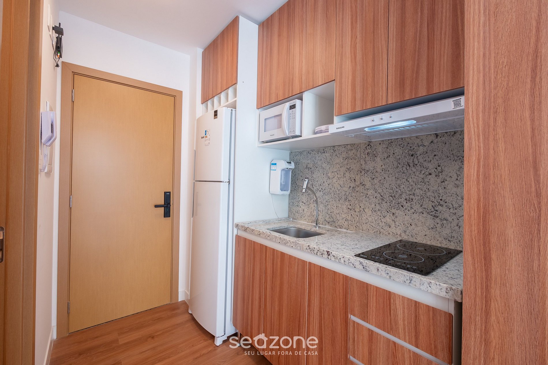 - Cocina completa con refrigerador, cocina eléctrica de inducción, microondas, sandwichera, kit de café (soporte para filtro, termo), tetera, licuadora, copas de vino, ollas, vajilla y utensilios;