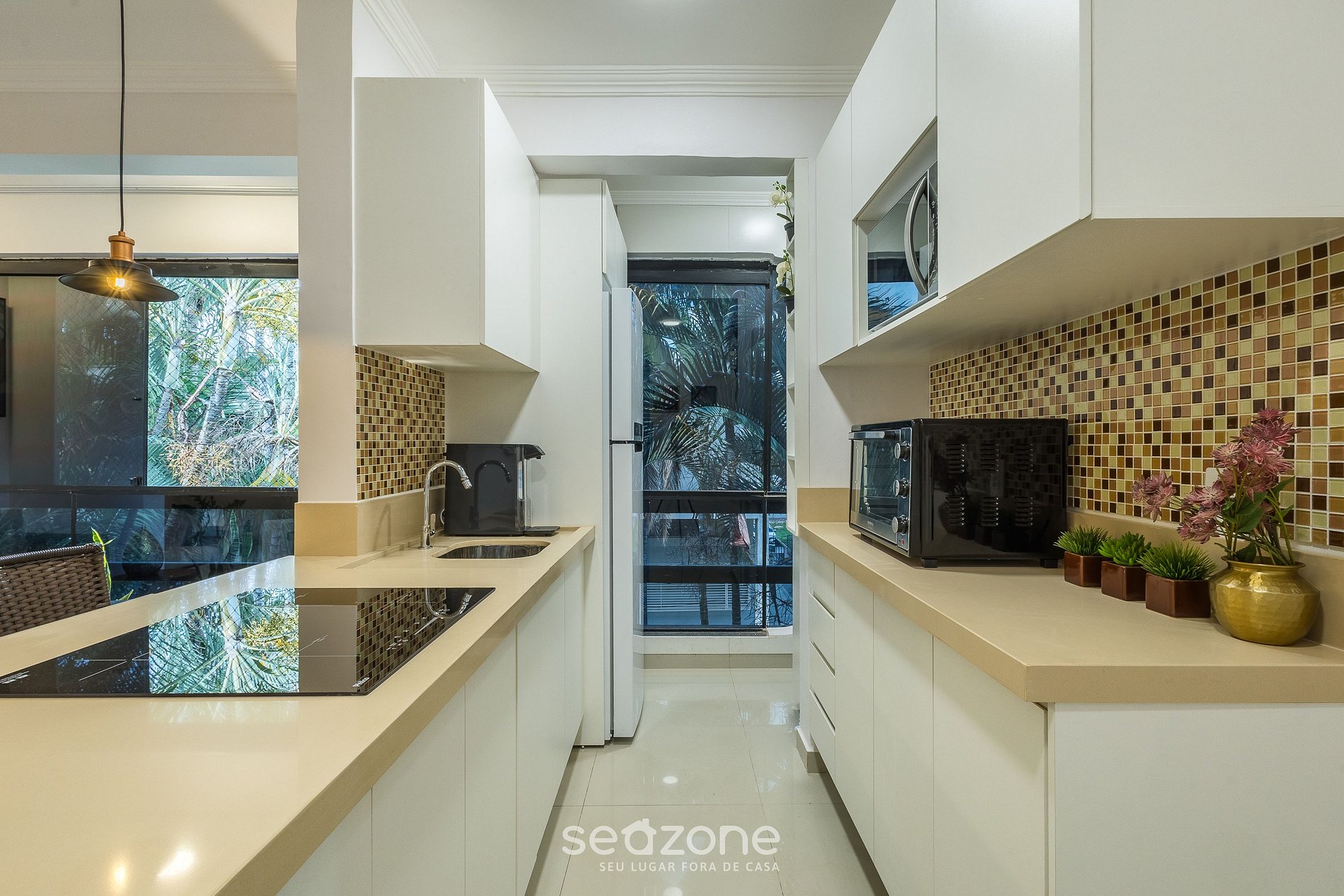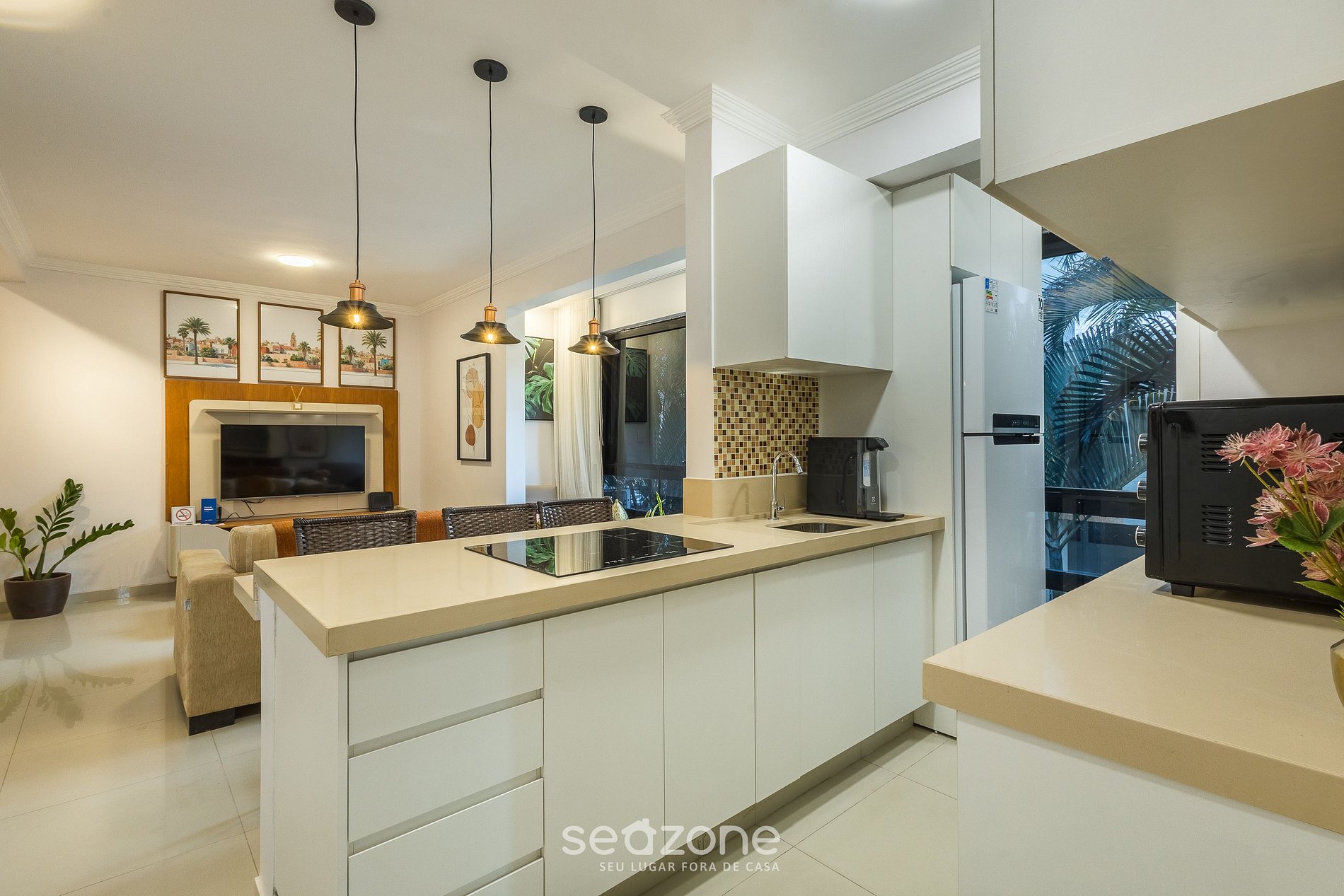 - Cocina totalmente equipada con refrigerador, placa de inducción, microondas, sandwichera, kit de café (portafiltro y termo), hervidor, ollas, vajilla y utensilios;