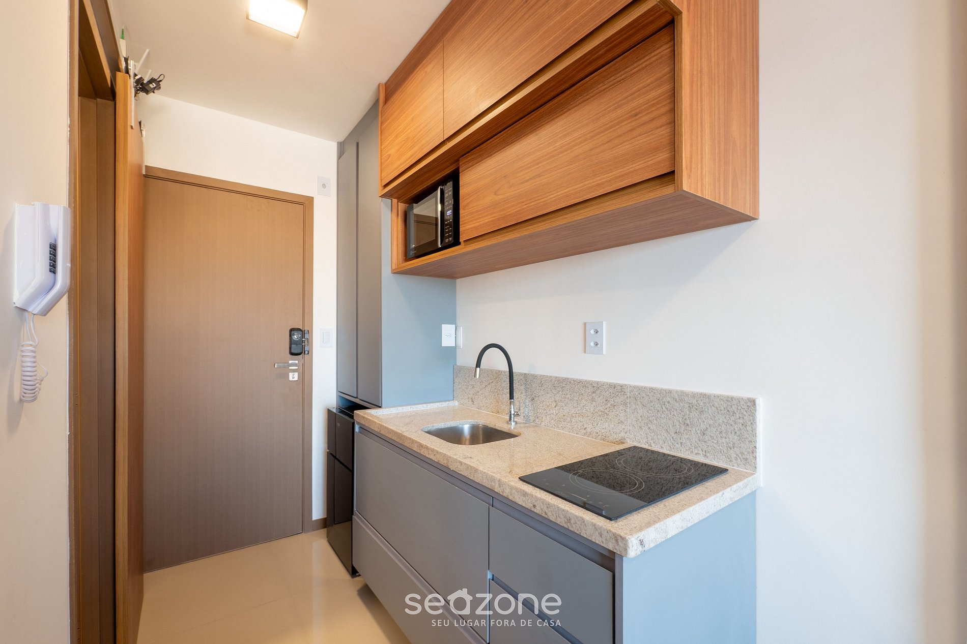 - Cocina totalmente equipada con mininevera, placa de inducción, microondas, cafetera eléctrica, copas de vino, ollas, sartenes, platos y utensilios;