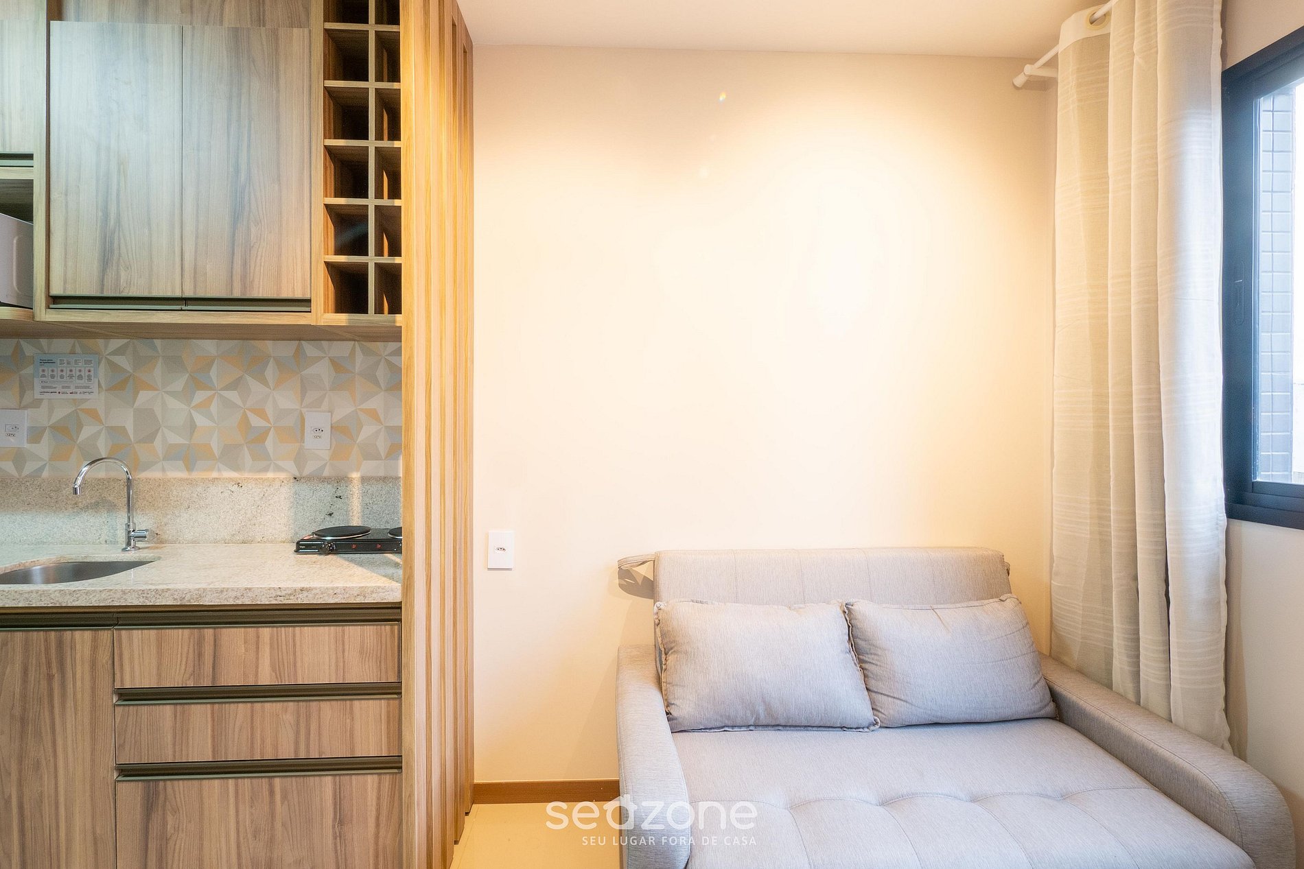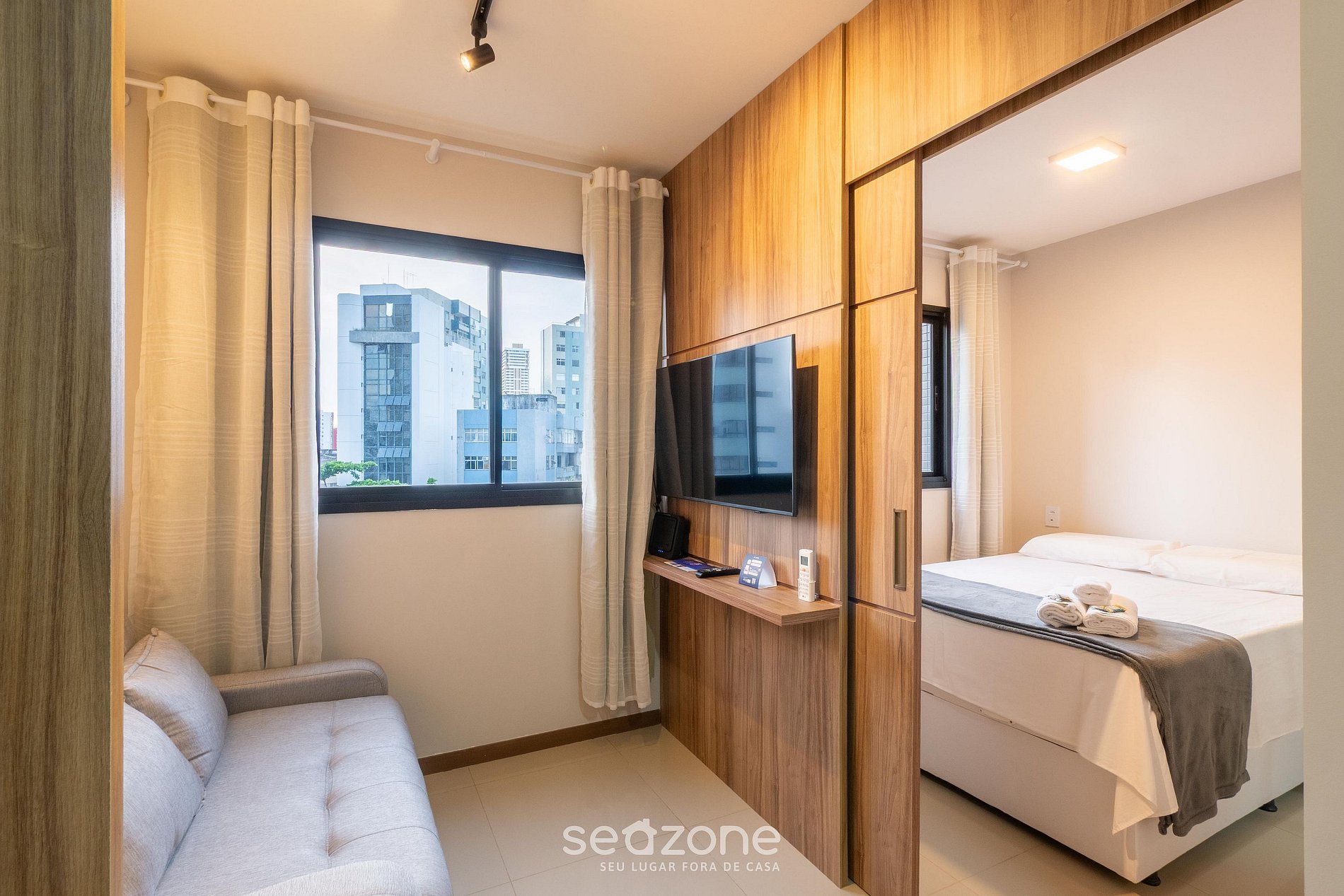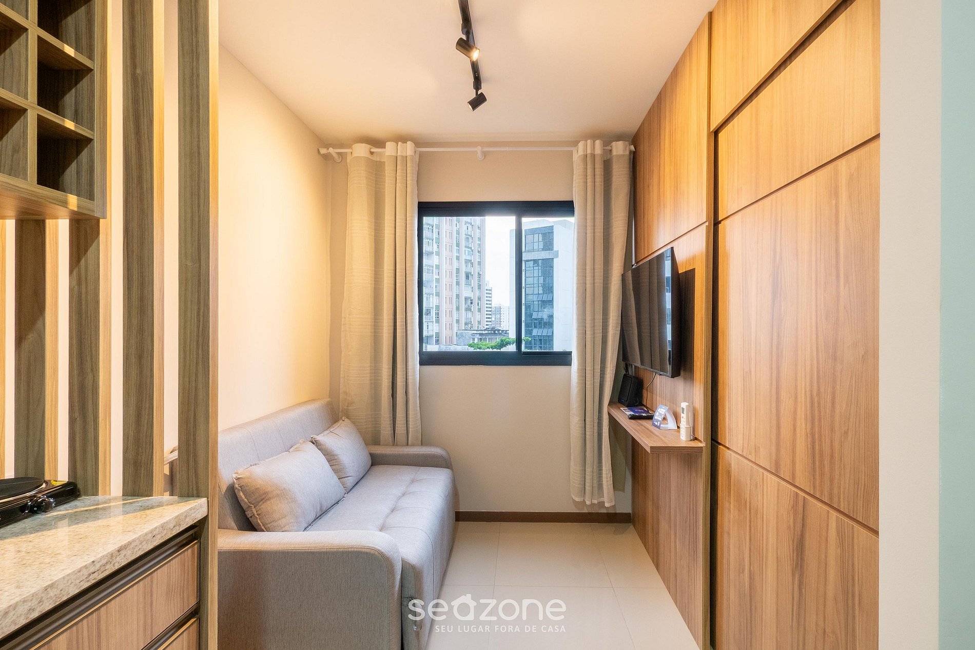 - Sala de estar con sofá, cortinas opacas y Smart TV;