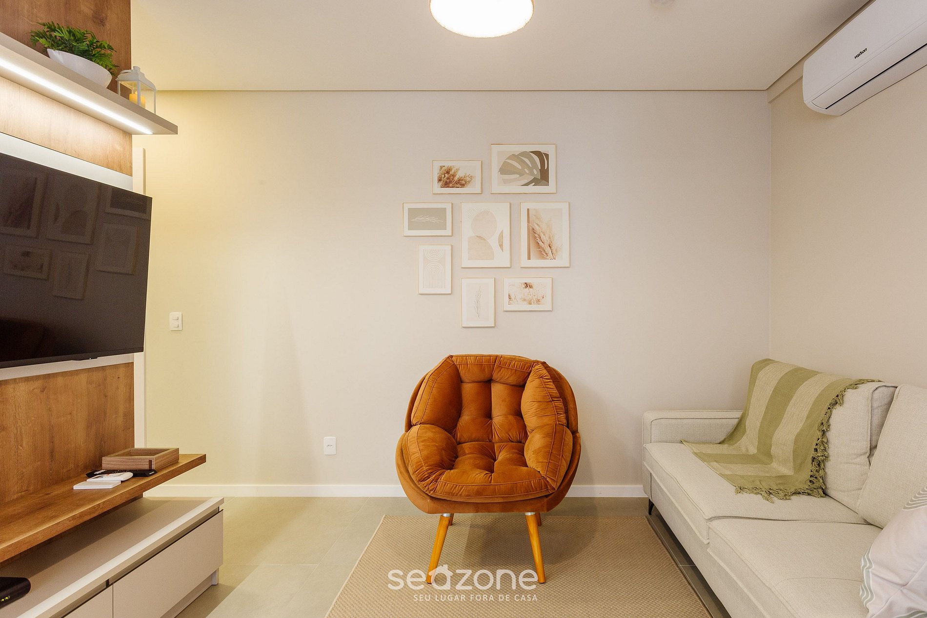 - Salón con sofá, smart TV y aire acondicionado;