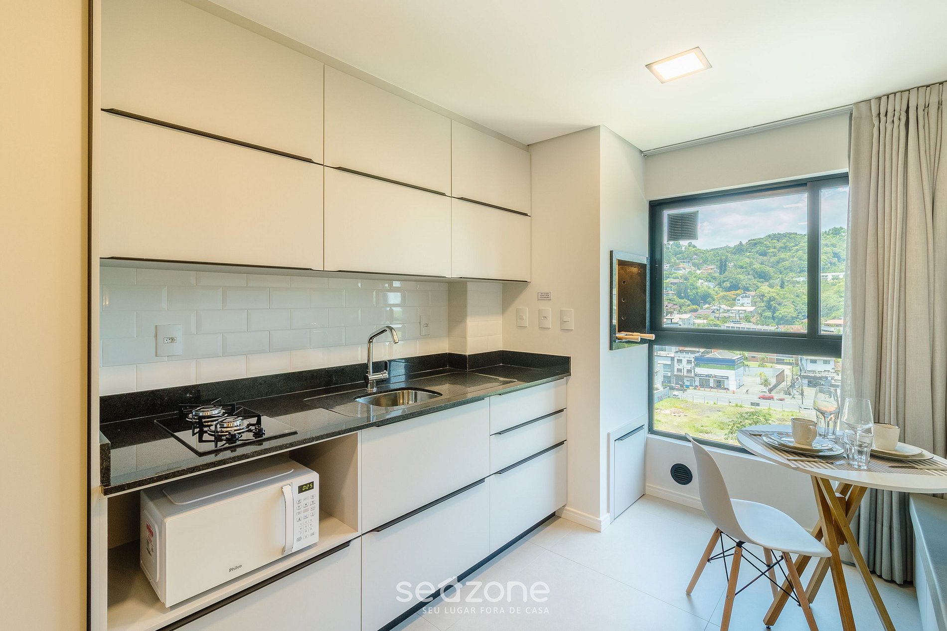 - Cocina totalmente equipada con refrigerador, placa de gas, microondas, sandwichera, kit de café (portafiltro, termo), hervidor eléctrico, licuadora, copas de vino, ollas, platos y utensilios;