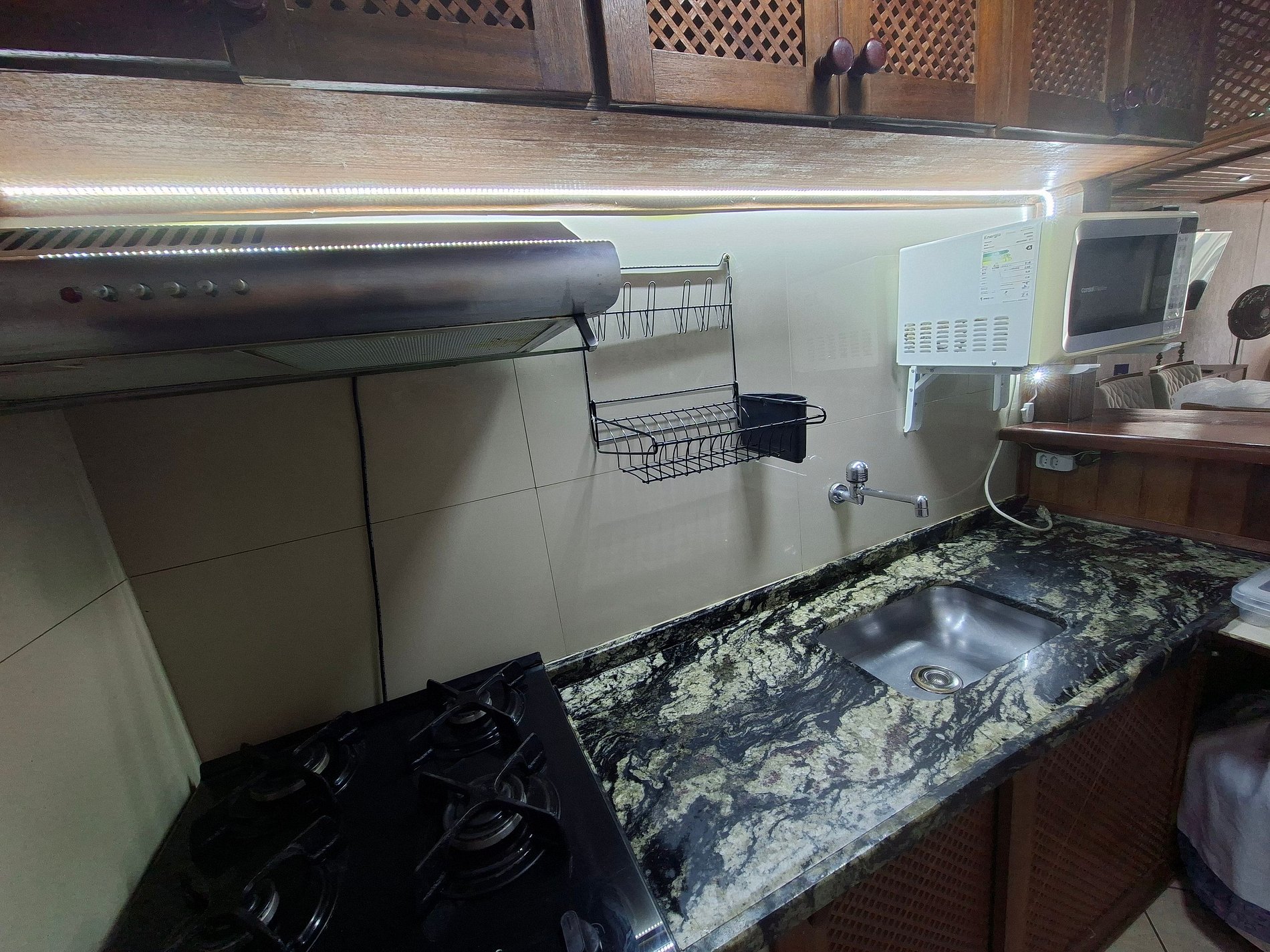 - Cocina totalmente equipada con refrigerador, cocina y horno a gas, microondas, sandwichera, cafetera eléctrica, hervidor tradicional, licuadora, copas de vino, ollas, vajilla y utensilios;