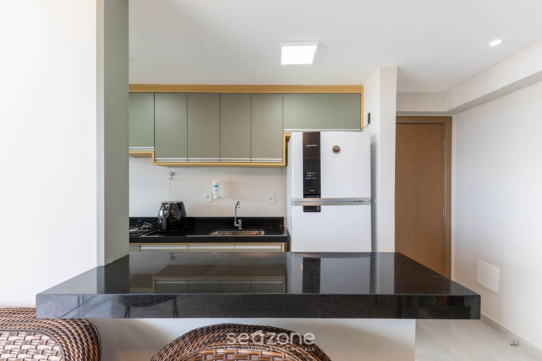 - Cocina totalmente equipada con refrigerador, placa de gas, horno eléctrico, freidora de aire, microondas, sandwichera, cafetera eléctrica, hervidor eléctrico, licuadora, ollas, sartenes, vajilla y utensilios;