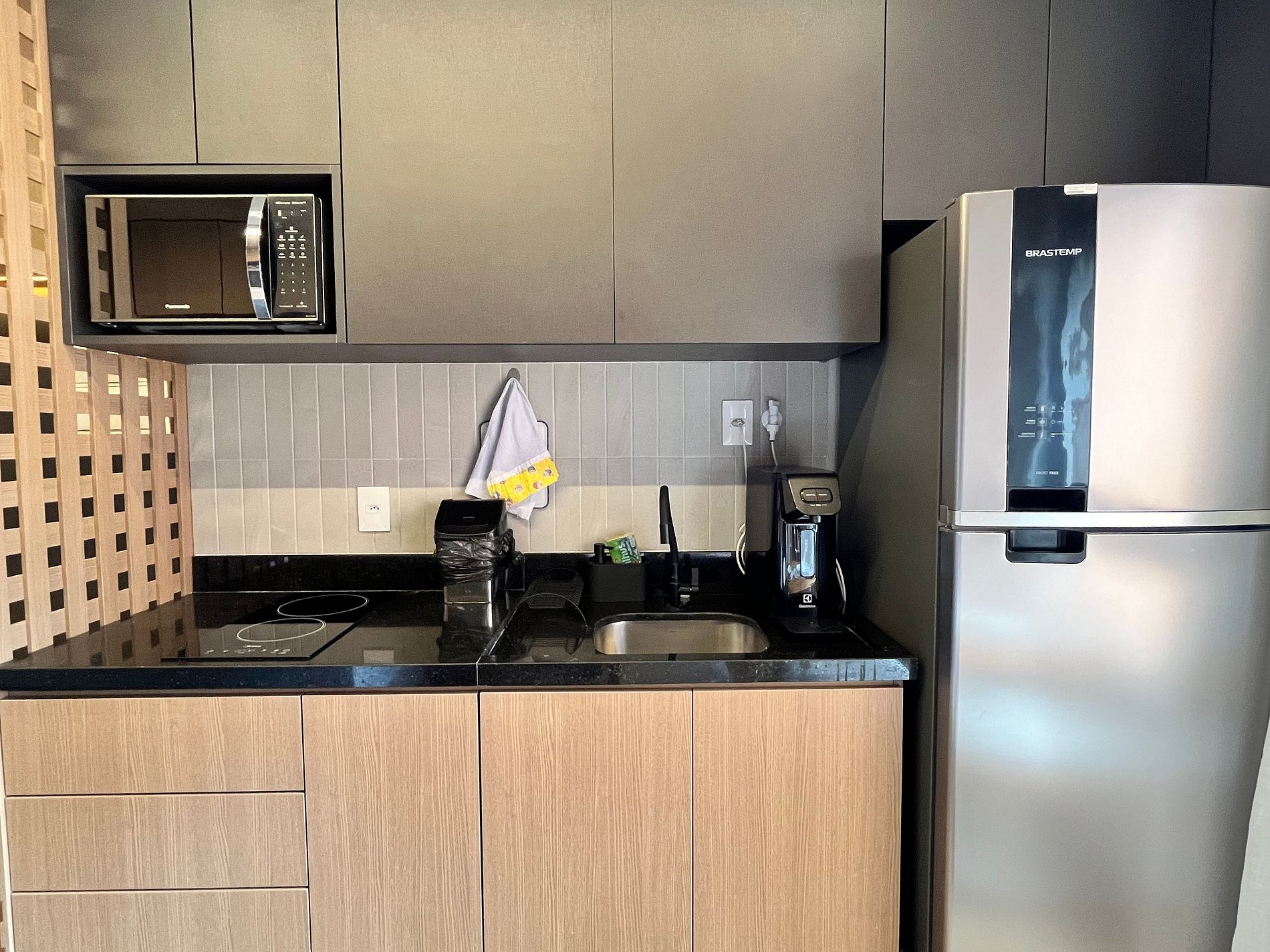 - Cocina completa con refrigerador, cocina de inducción, airfryer, microondas, sandwichera, kit de café (soporte para filtro y termo), licuadora, copas de vino, ollas, vajilla y utensilios;