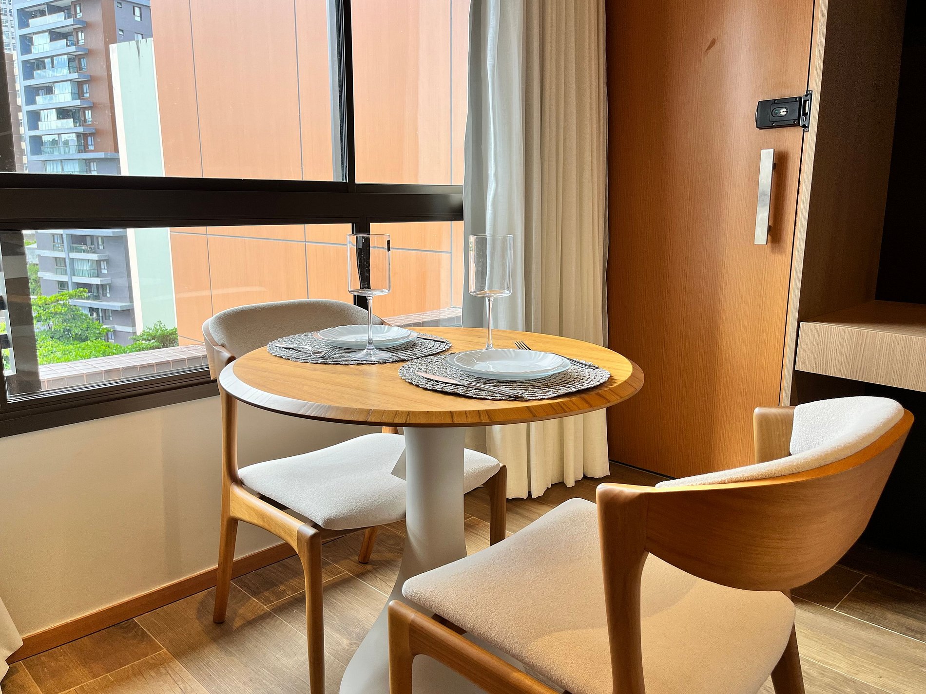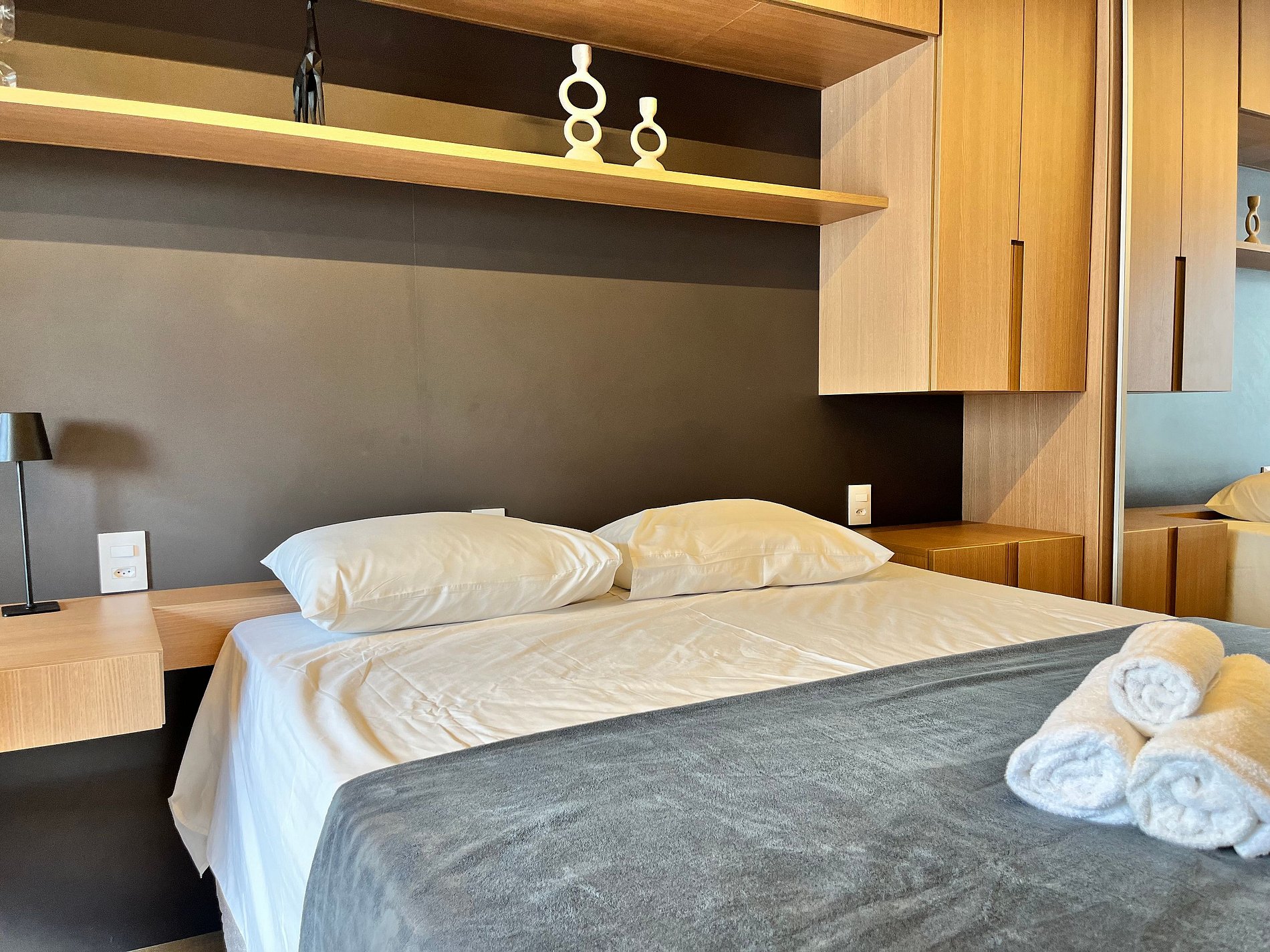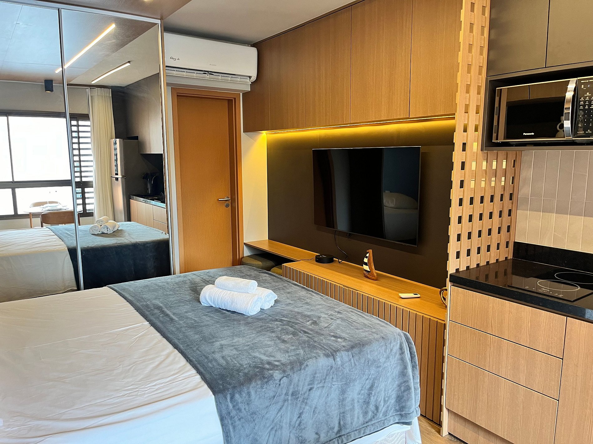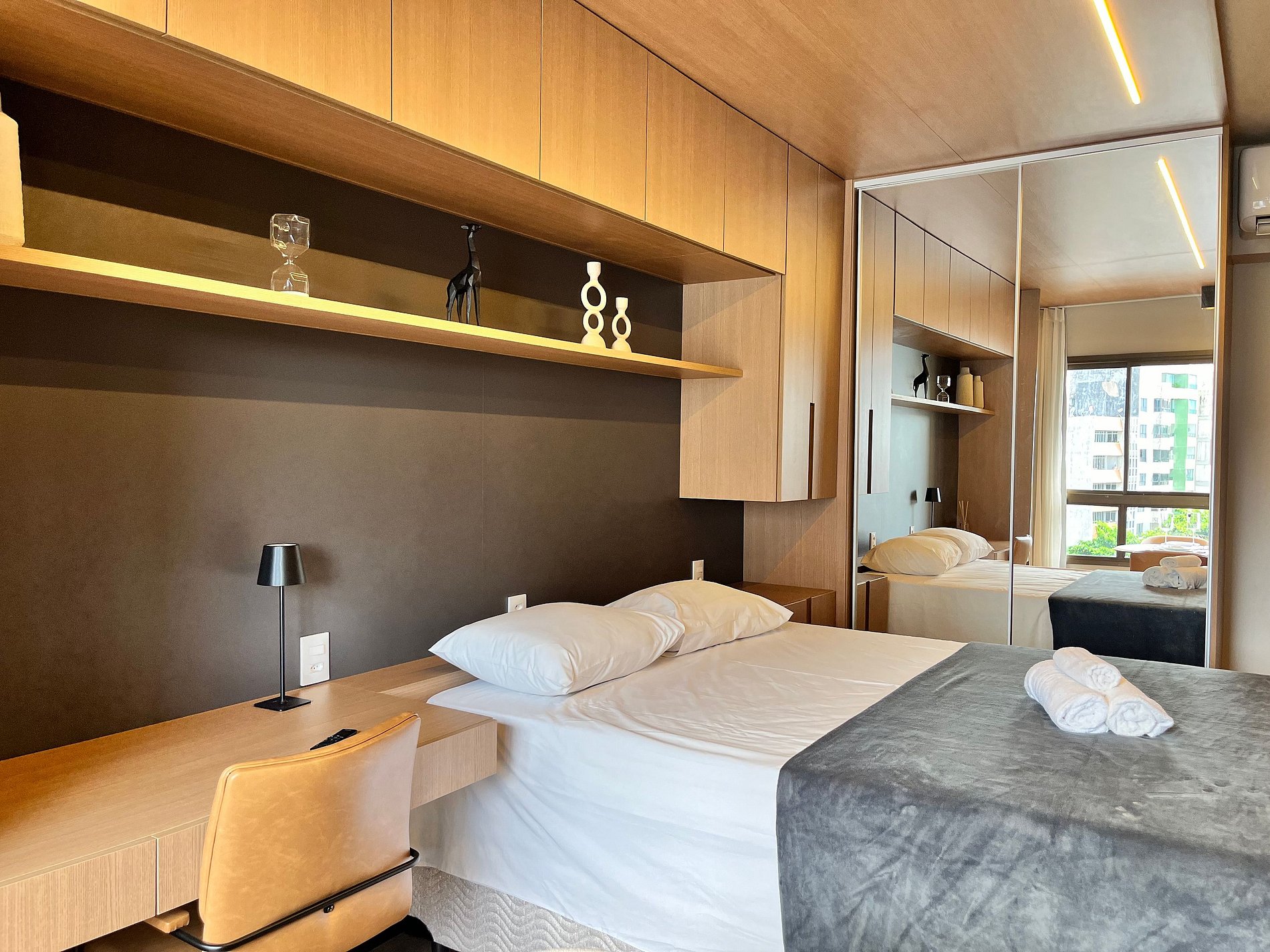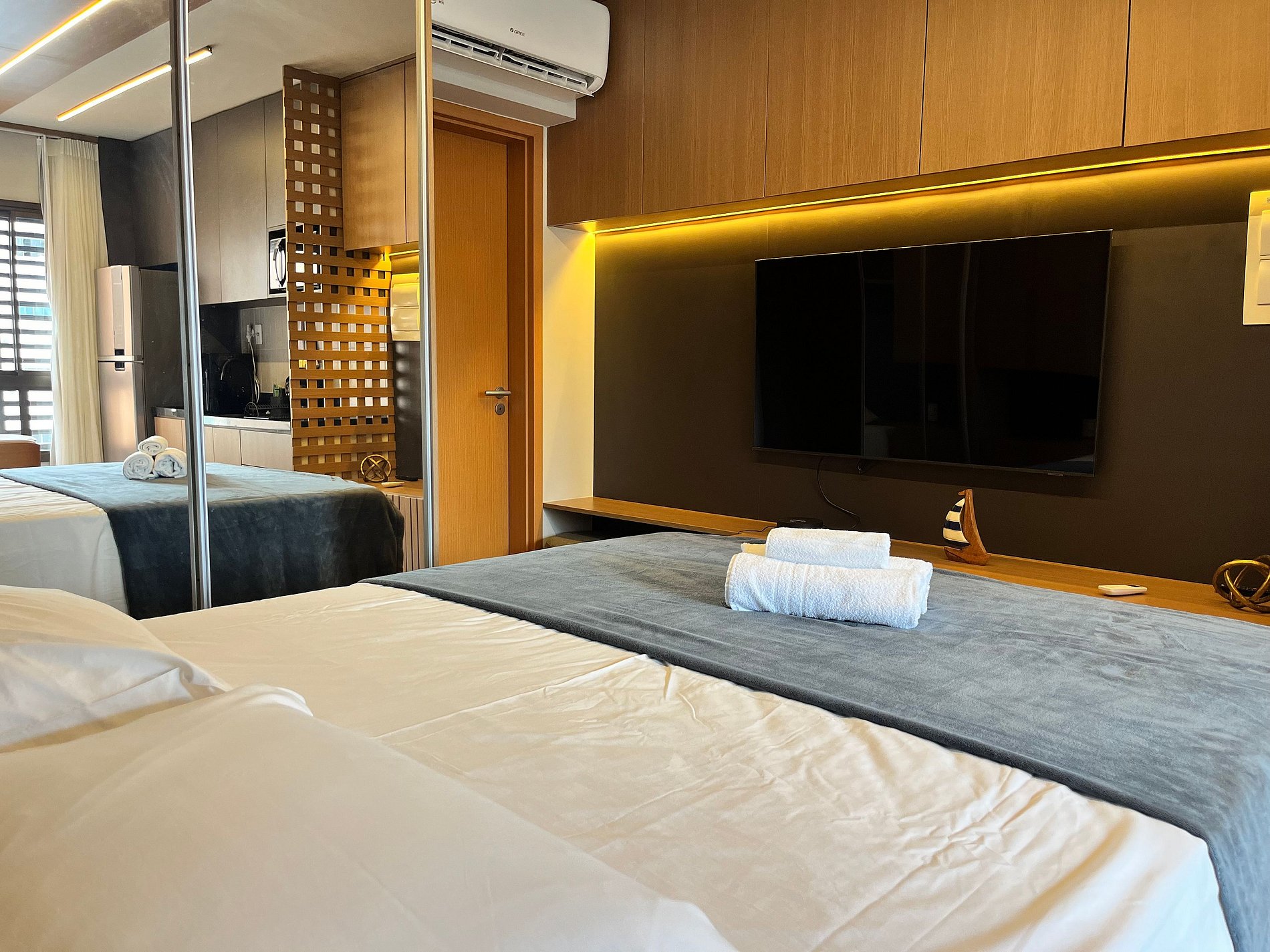 Estudio completo y climatizado, con cocina equipada, área de comedor, Wi-Fi y ropa de cama de estándar hotelero. El edificio ofrece piscina, gimnasio y una estructura funcional para el día a día. Ubicado a 750 m de la playa, con fácil acceso al Faro de Barra, mercados y cafeterías.
