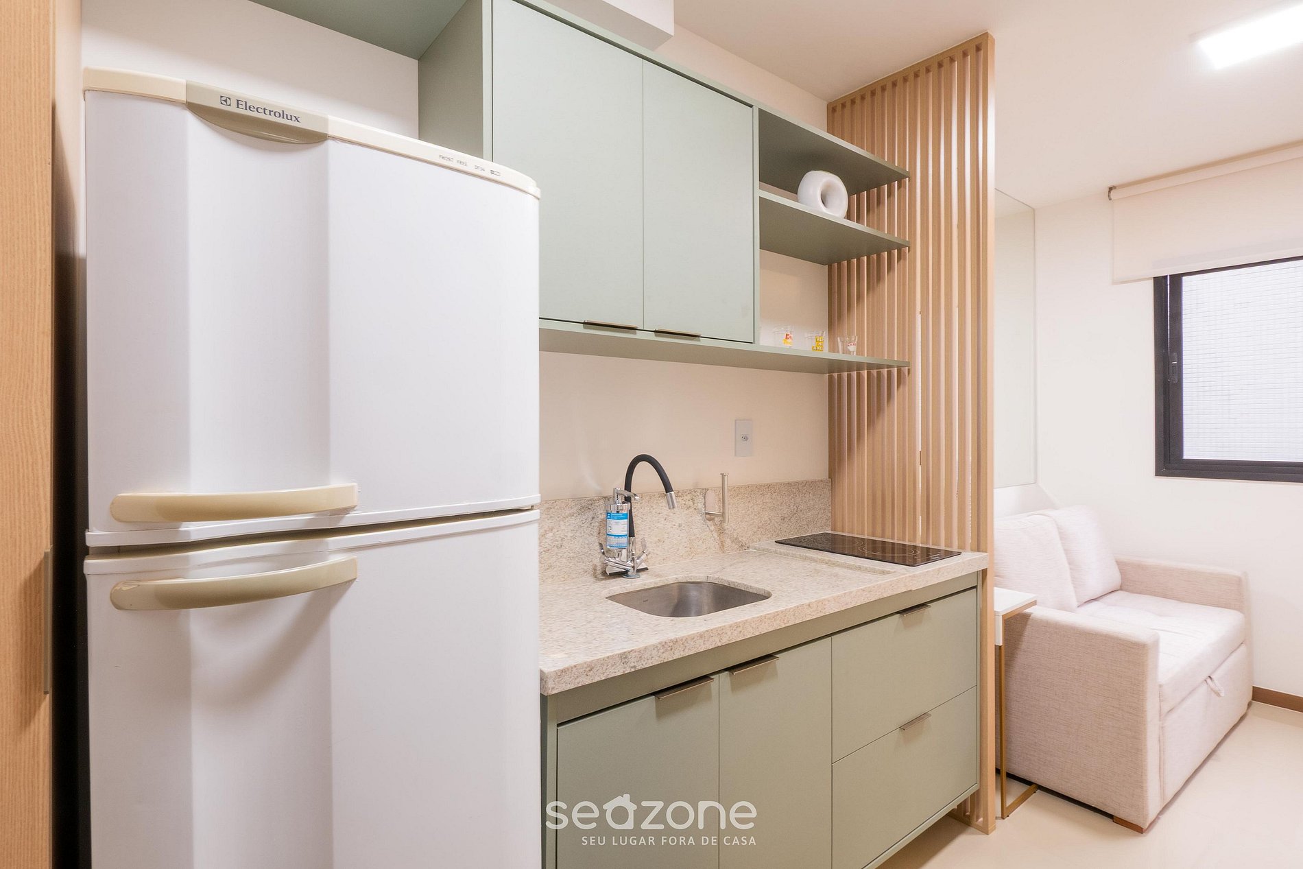 Cocina completa con refrigerador, estufa de inducción (2 hornallas), microondas, kit café (soporte para filtro, botella térmica), licuadora, copas, ollas, vajillas y utensilios;