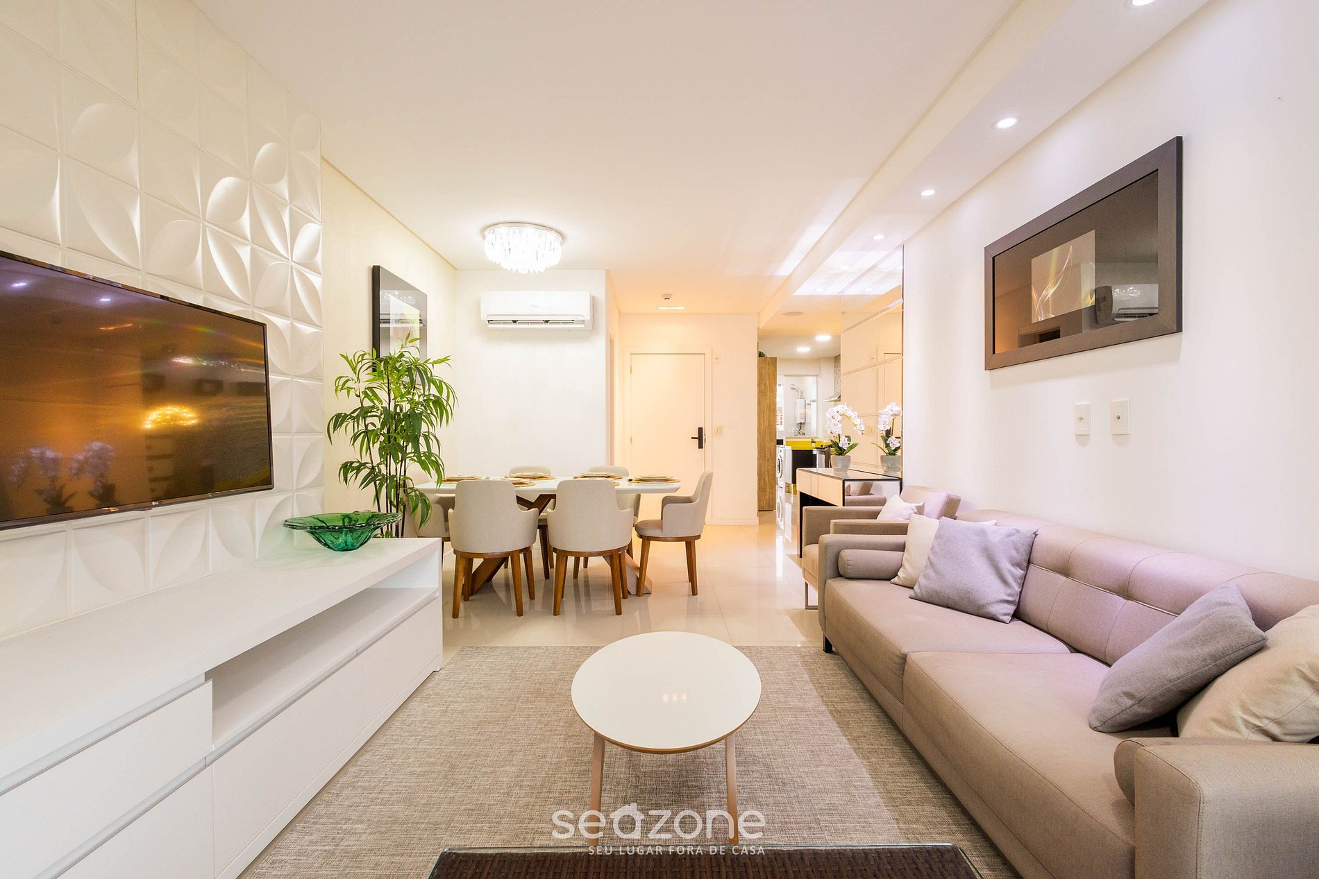 - Sala de estar con sofá, Smart TV y aire acondicionado;