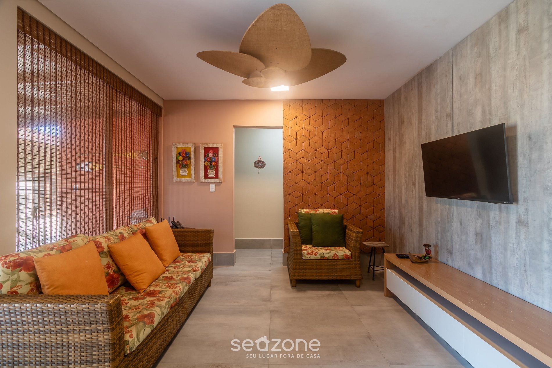 - Sala de estar con sofá, Smart TV y aire acondicionado;