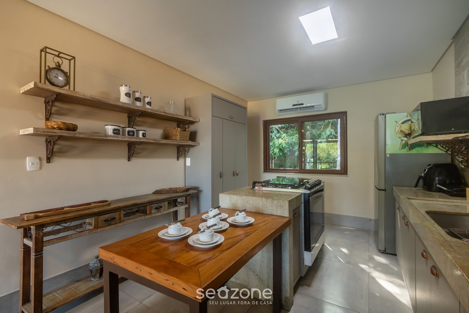 - Cocina completa con refrigerador, estufa y horno a gas, microondas, sandwichera, airfryer, kit de café (soporte para filtro y botella térmica), copas de vino, ollas, vajillas y utensilios;
