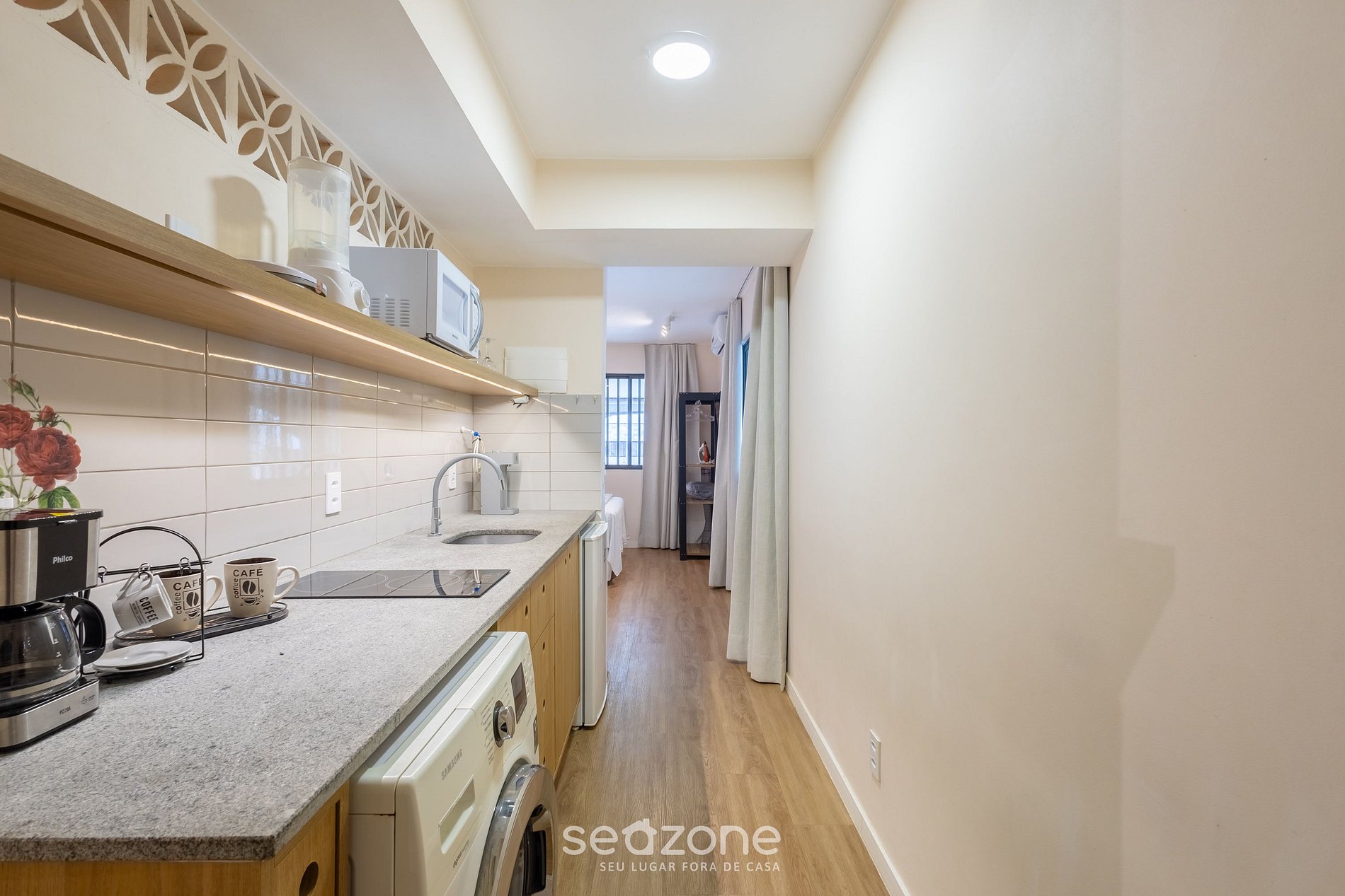 - Cocina totalmente equipada con refrigerador, placa de inducción, microondas, sandwichera, cafetera eléctrica, licuadora, copas de vino, ollas, sartenes, platos y utensilios;
