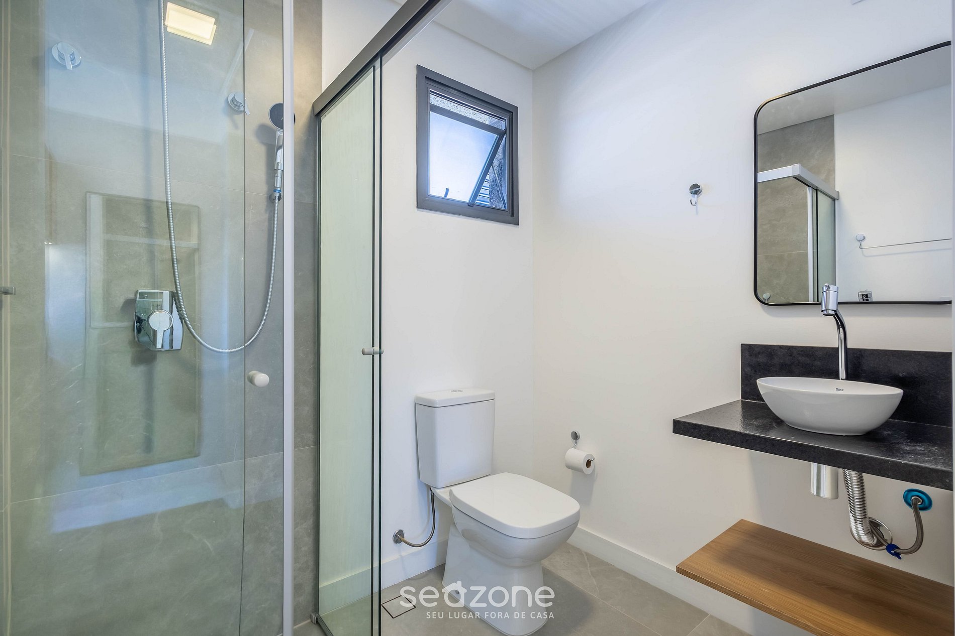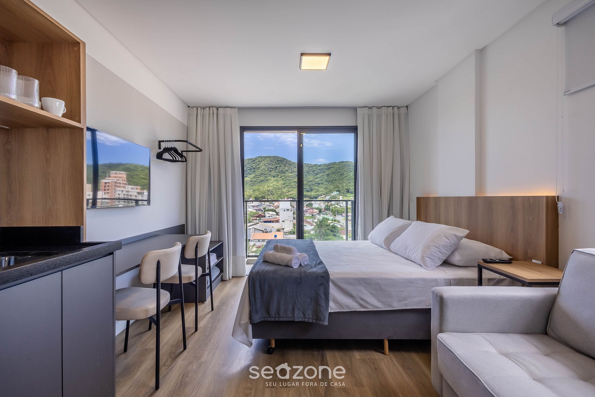 Studio moderno y bien distribuido, ubicado en un edificio frente al mar en la Playa de Armação do Itapocorói. Cuenta con cama queen, sofá cama, aire acondicionado, Smart TV, cocina totalmente equipada, barra para comidas y balcón con vista lateral al mar y a la ciudad. El condominio ofrece piscina con borde infinito y cafetería. A pocos pasos de la playa y con fácil acceso a Beto Carrero World.