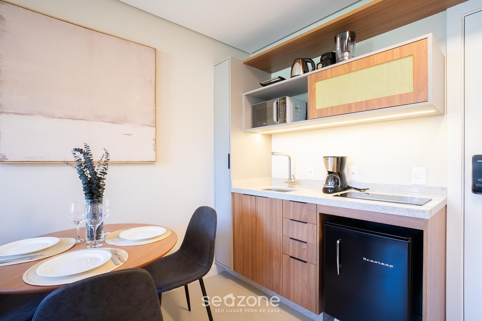 - Cocina totalmente equipada con mininevera, placa de inducción, microondas, sandwichera, cafetera eléctrica, hervidor, licuadora, copas de vino, ollas, sartenes, platos y utensilios;