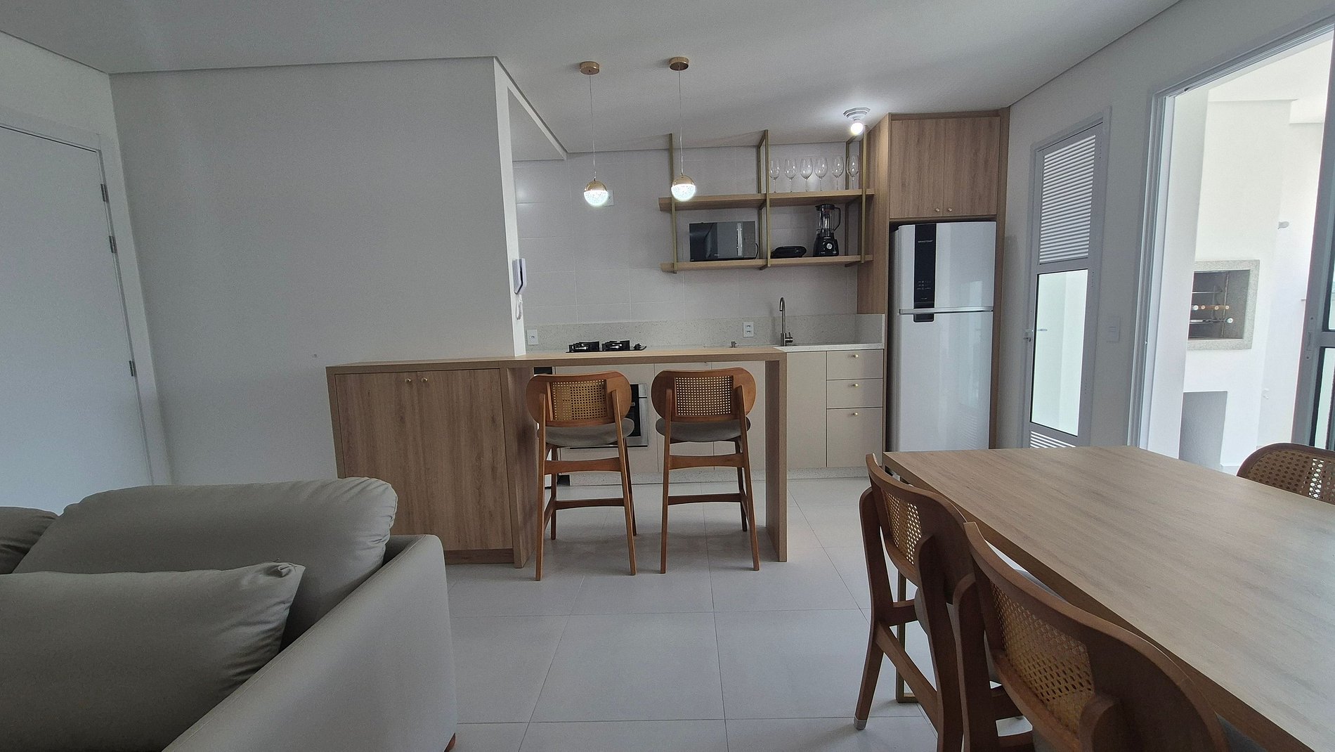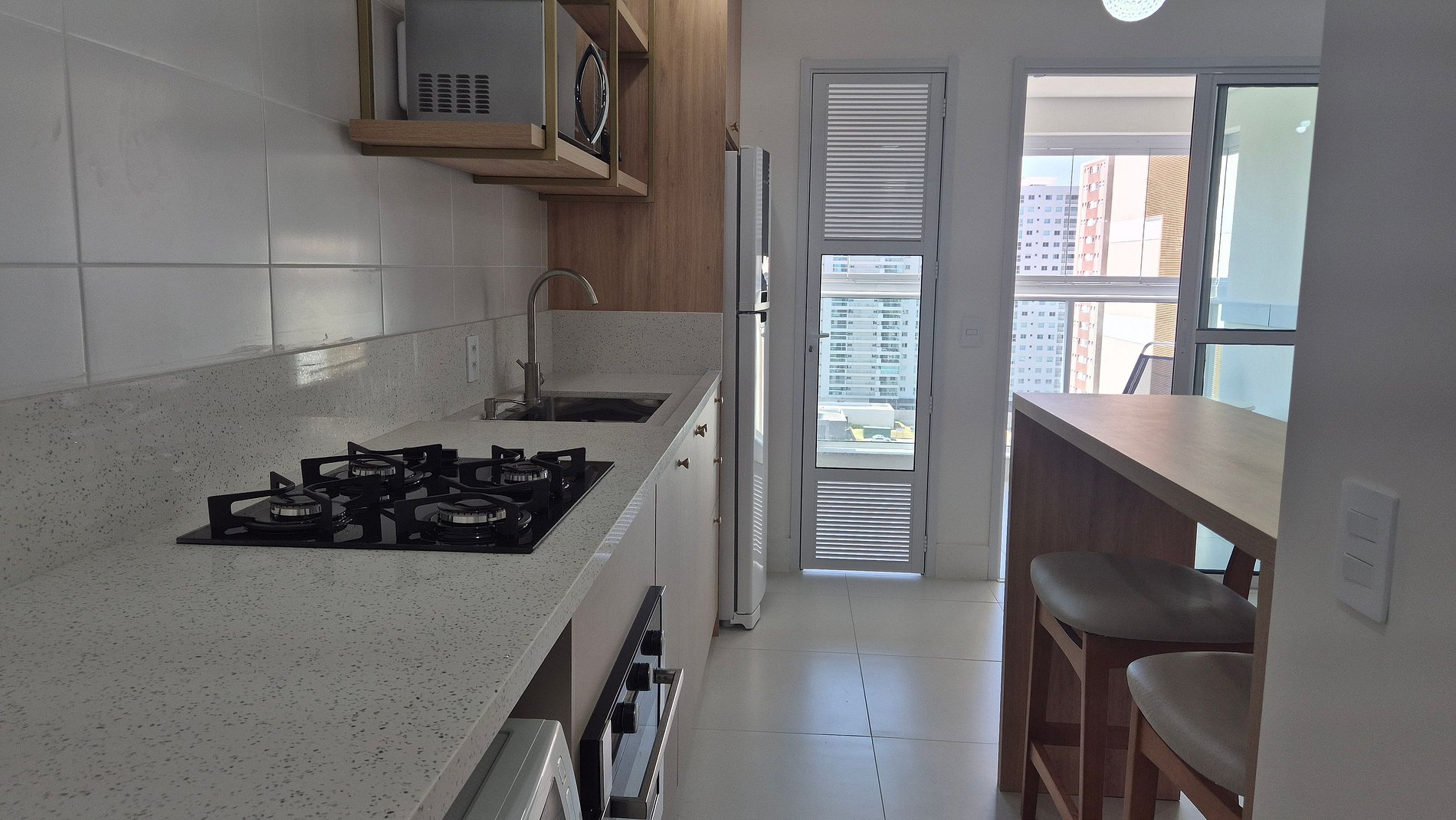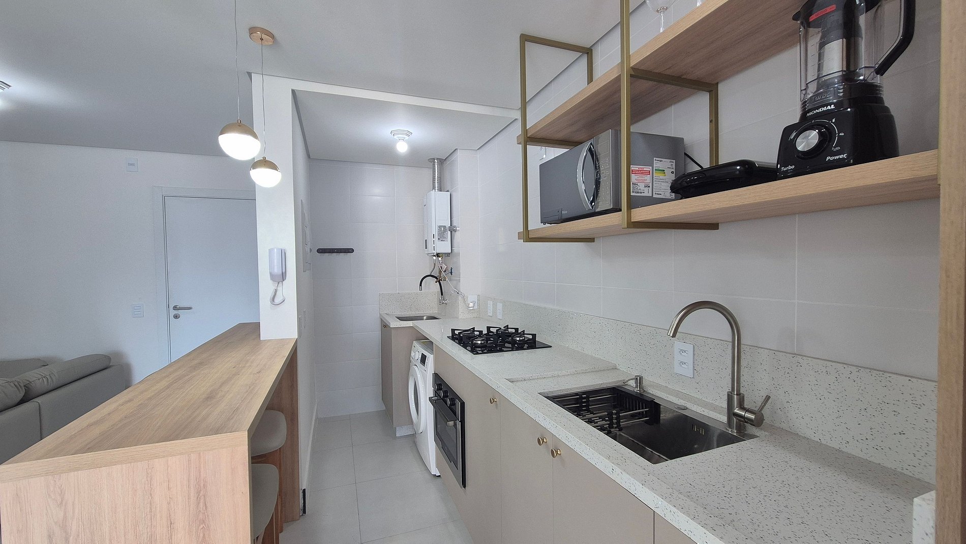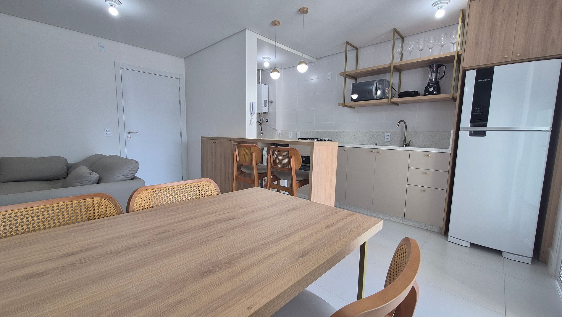- Cocina totalmente equipada con refrigerador, placa de gas, horno eléctrico, microondas, sandwichera, kit de café (portafiltros, termo), tetera, licuadora, copas de vino, ollas, platos y utensilios;