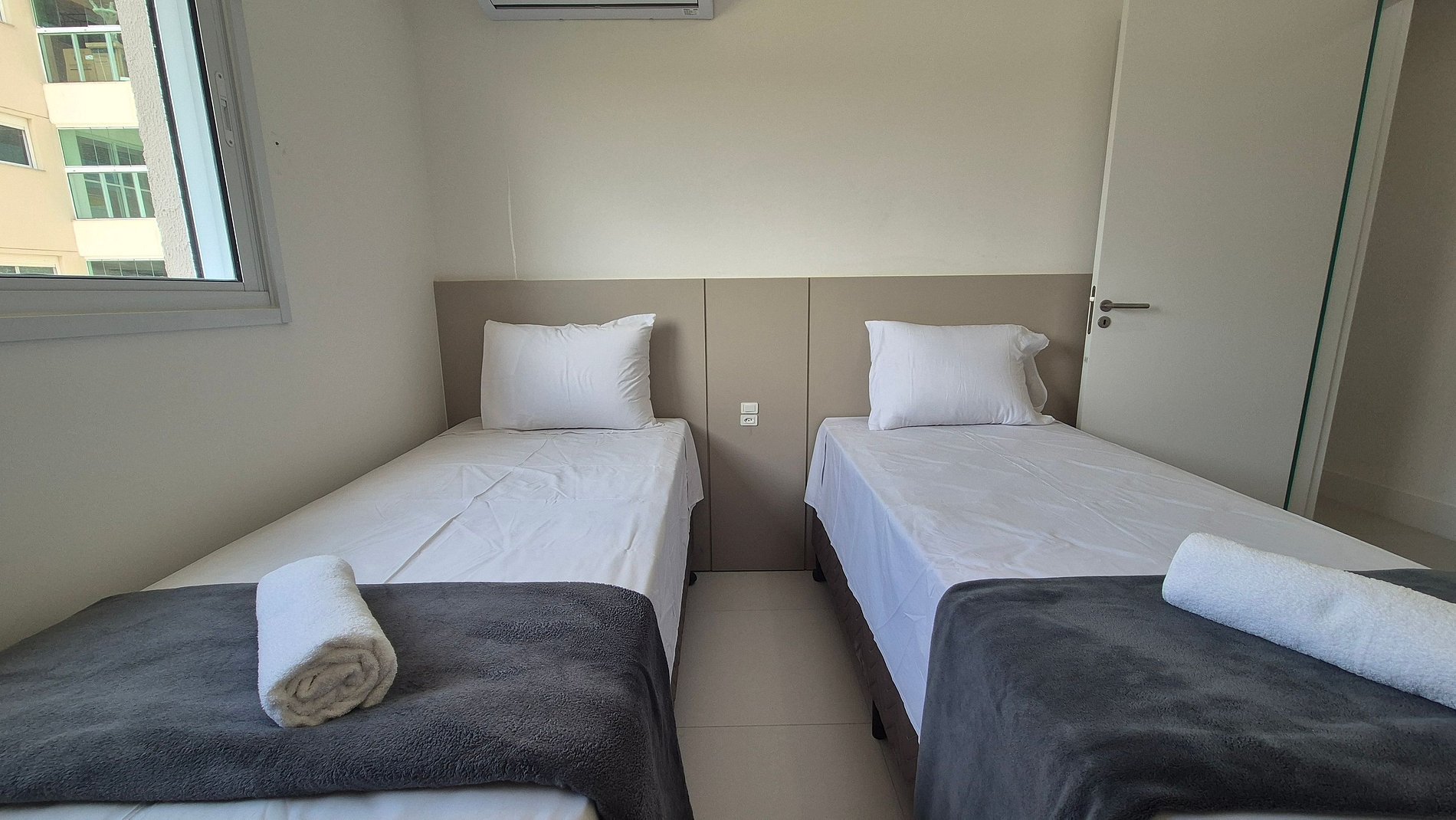 - 1 dormitorio con 2 camas dobles, perchero y aire acondicionado;