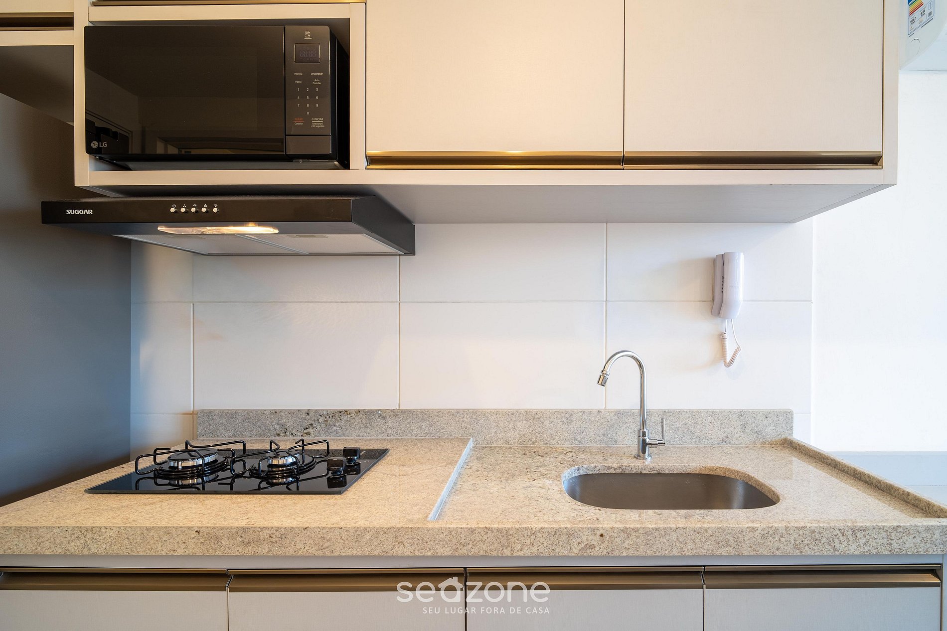 - Cocina totalmente equipada con nevera, placa de gas, microondas, sandwichera, cafetera eléctrica, licuadora, copas de vino, ollas, platos y utensilios;