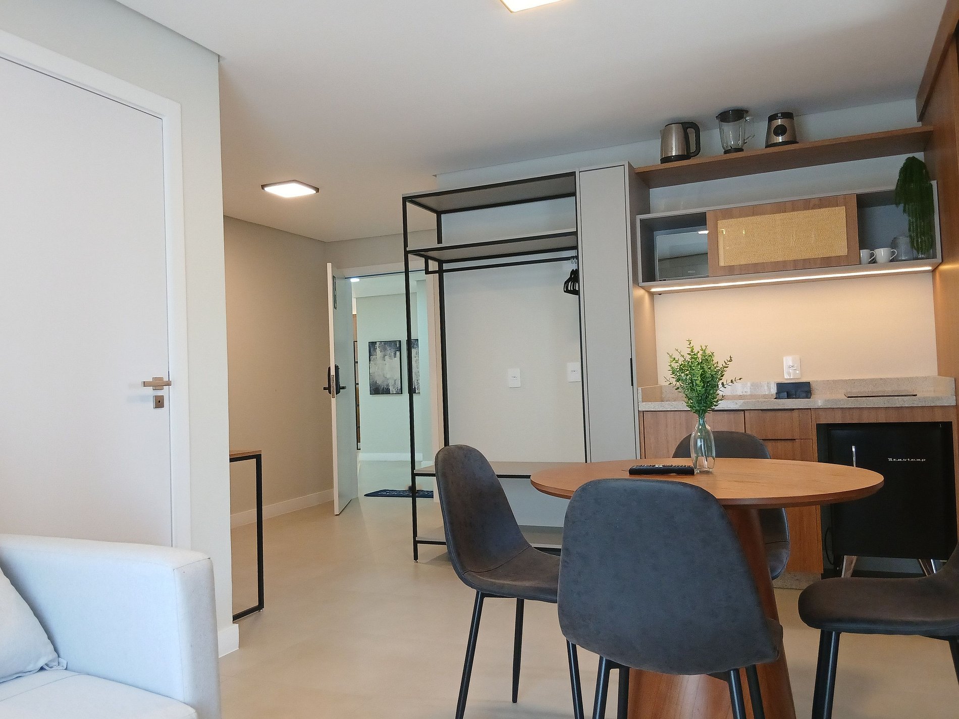 Cocina totalmente equipada con frigobar, cooktop de inducción, microondas, cafetera eléctrica, hervidor eléctrico, licuadora, copas de vino, ollas, vajilla y utensilios;