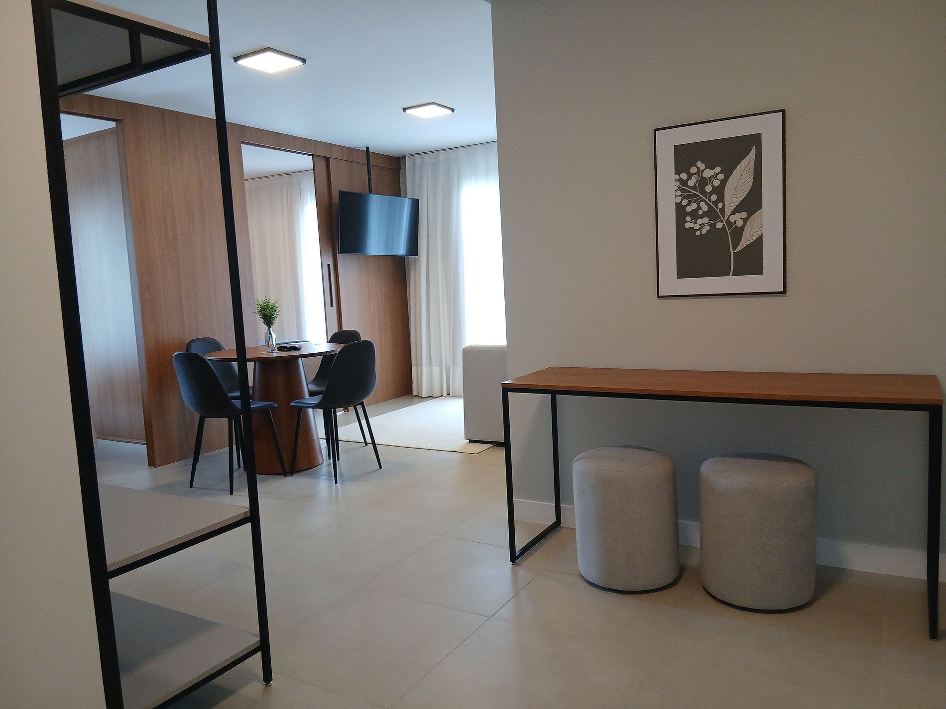 Con ambientes bien distribuidos, este apartamento ofrece dos dormitorios con cama queen y aire acondicionado, una sala confortable con sofá cama y Smart TV, además de cocina equipada y espacio para comidas. El balcón aporta ligereza al ambiente. El edificio cuenta con piscina de borde infinito y área gourmet en el rooftop. Fácil acceso a las playas de Rosa, la Laguna de Ibiraquera y Surfland.