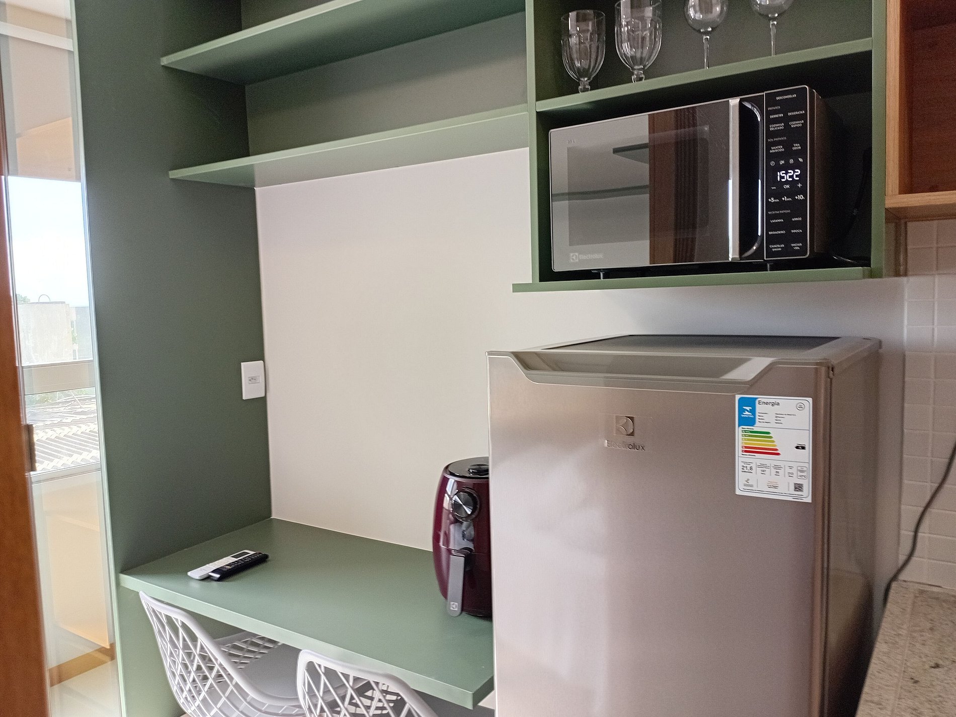 - Cocina completa con refrigerador, cocina eléctrica tipo cooktop, microondas, airfryer, sandwichera, cafetera eléctrica, licuadora, copas de vino, vajilla y utensilios;