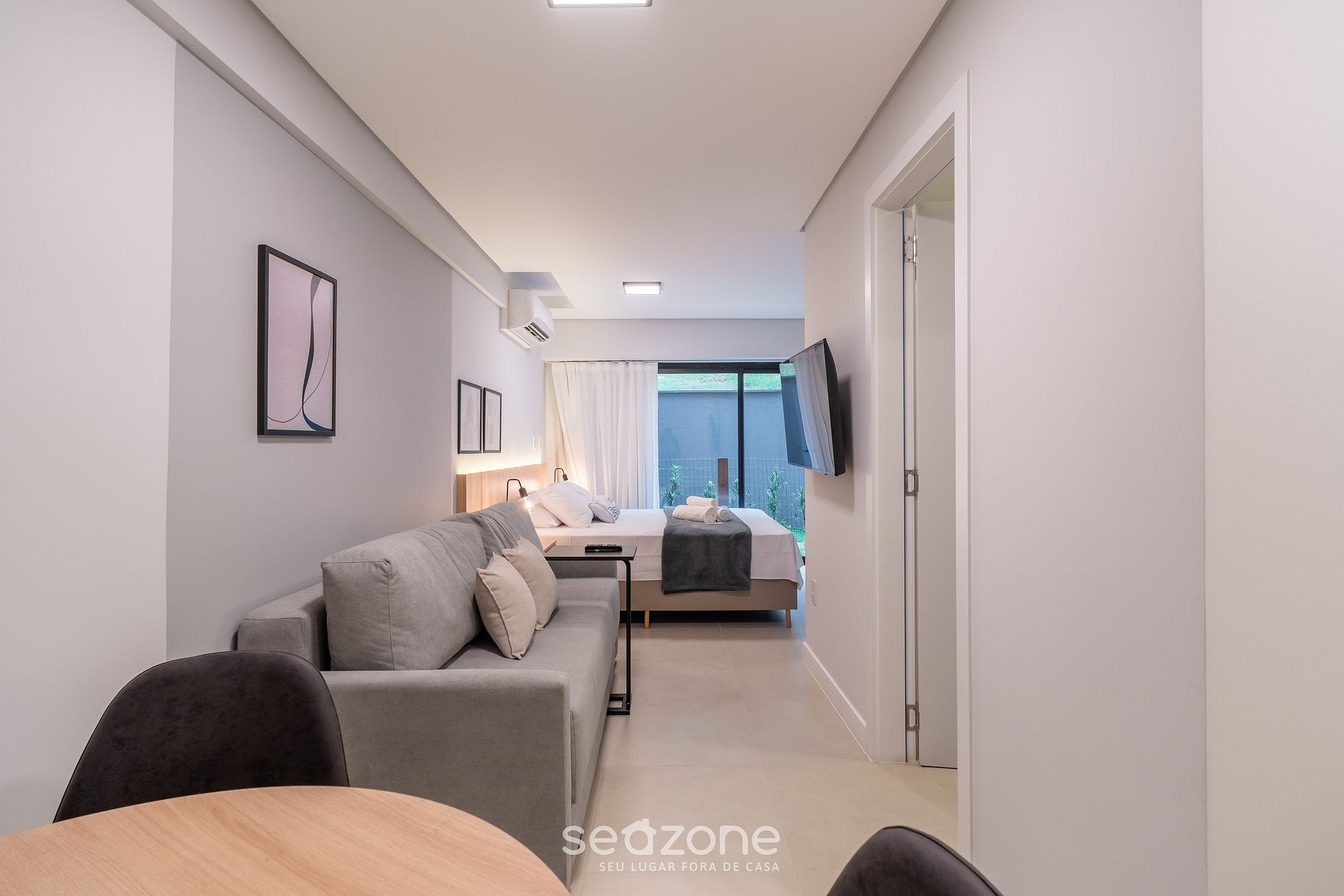 - Cama queen-size, sofá cama doble, perchero, Smart TV y aire acondicionado;