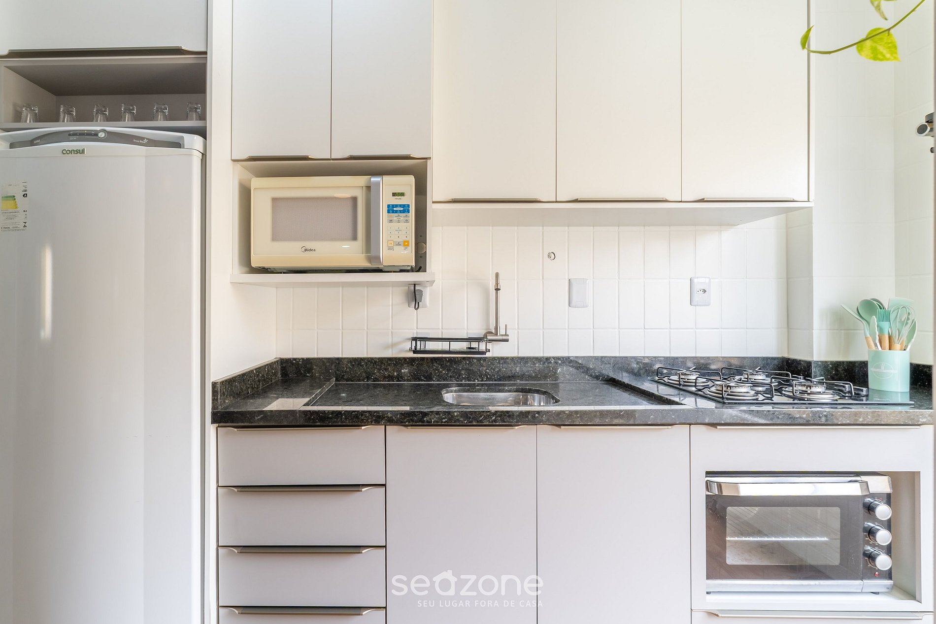 - Cocina totalmente equipada con refrigerador, placa de gas, horno eléctrico, microondas, sandwichera, cafetera eléctrica de cápsulas, hervidor eléctrico, licuadora, copas de vino, ollas, sartenes, platos y utensilios;