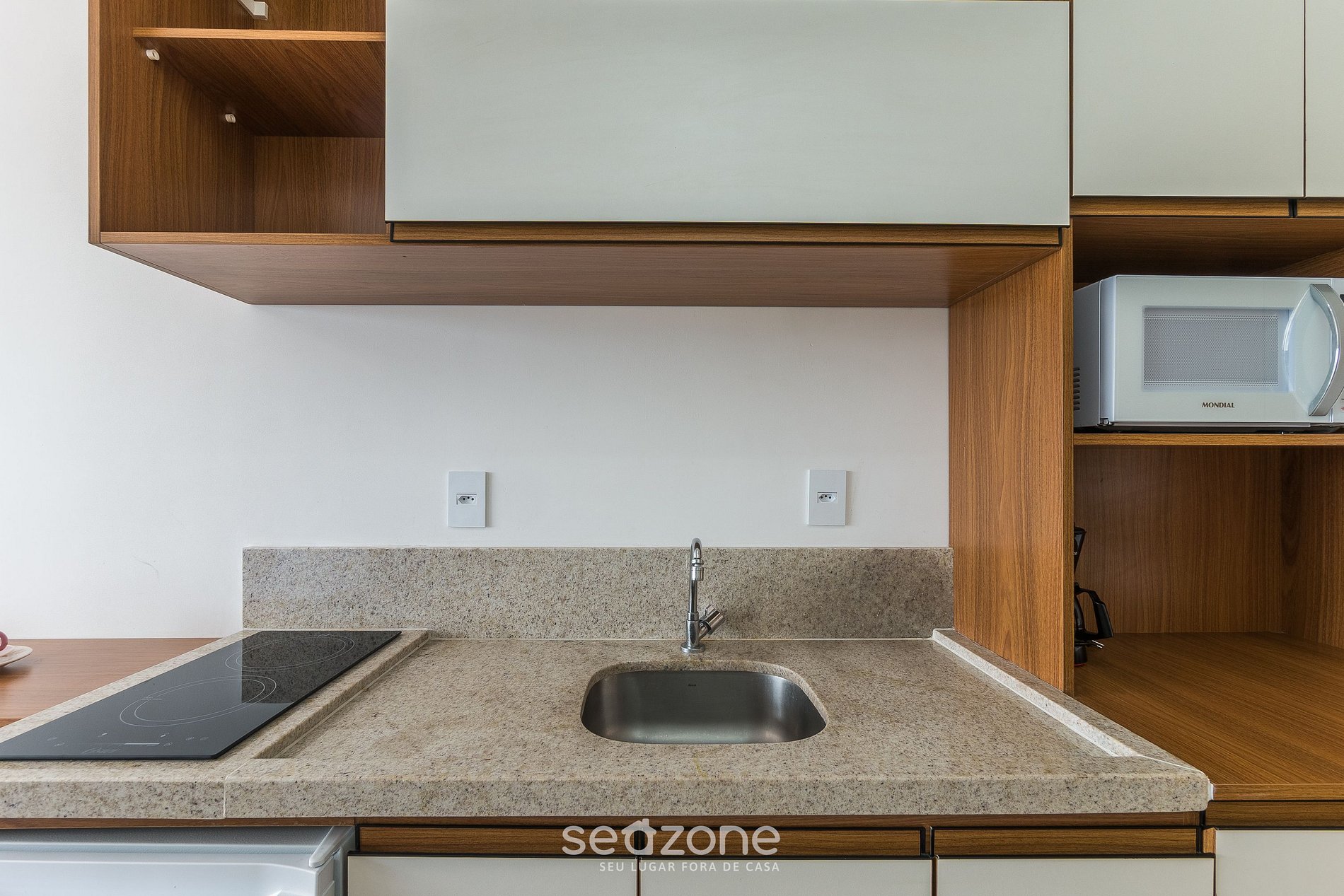 Cocina completa con frigobar, cocina de inducción, microondas, sandwichera, cafetera eléctrica, hervidor, licuadora, copas de vino, ollas, vajilla y utensilios;