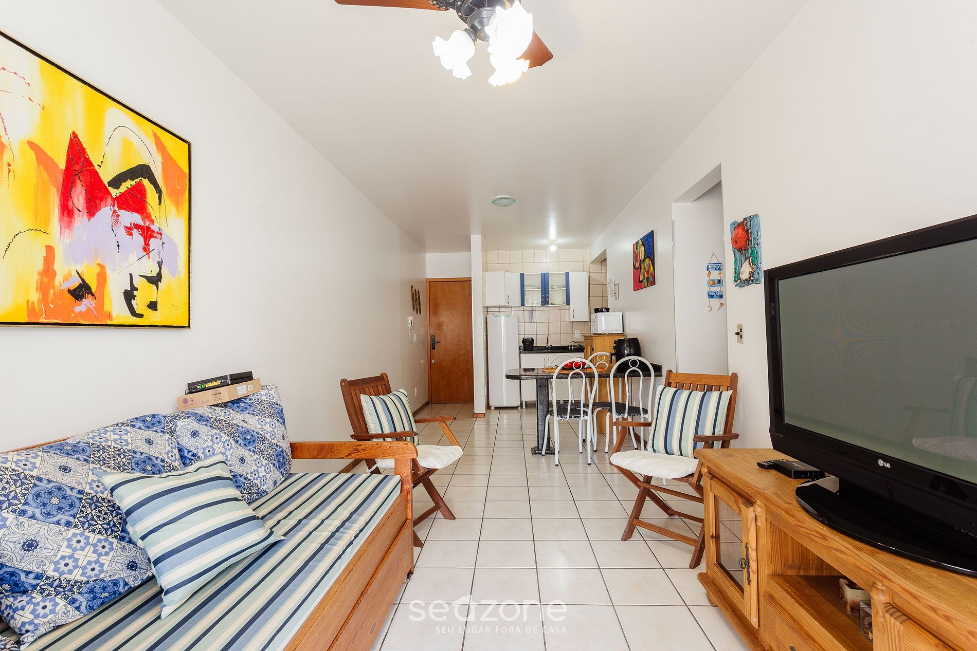 - 1 Dormitorio con dos camas individuales, armario, ventilador de techo y aire acondicionado;- Salón con sofá y TV de pantalla plana;