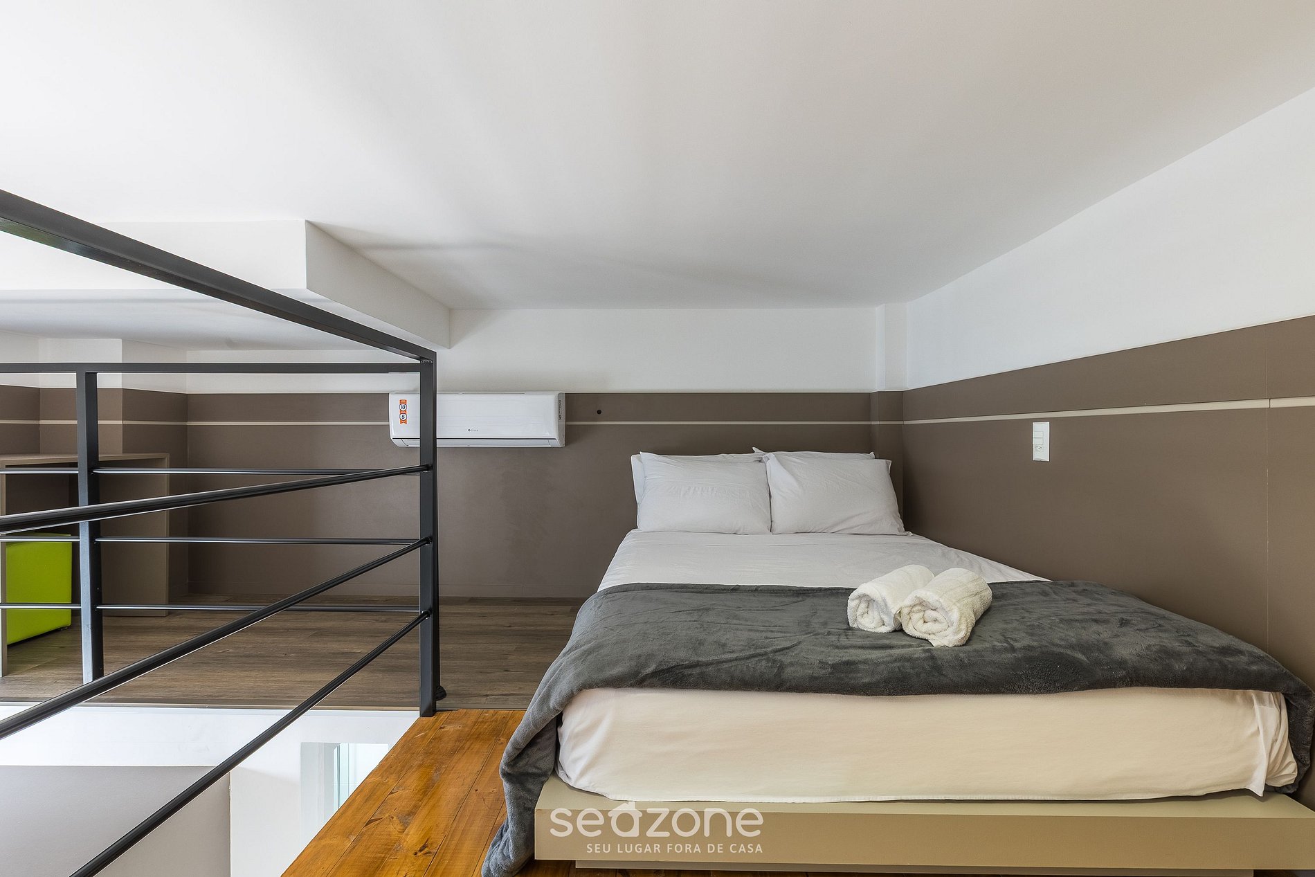 - Entrepiso con una cama doble, una cama doble empotrada en la parte inferior (detrás del sofá), aire acondicionado y Smart TV;