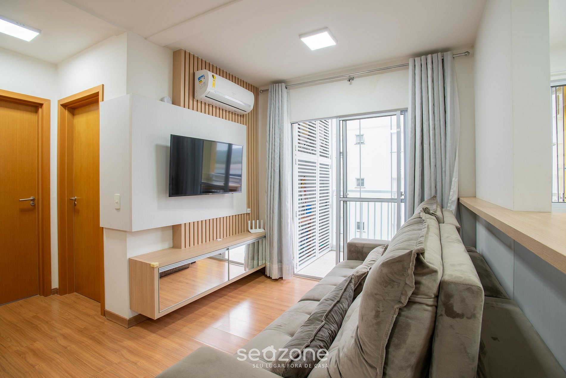 - Sala de estar con sofá, Smart TV y aire acondicionado;