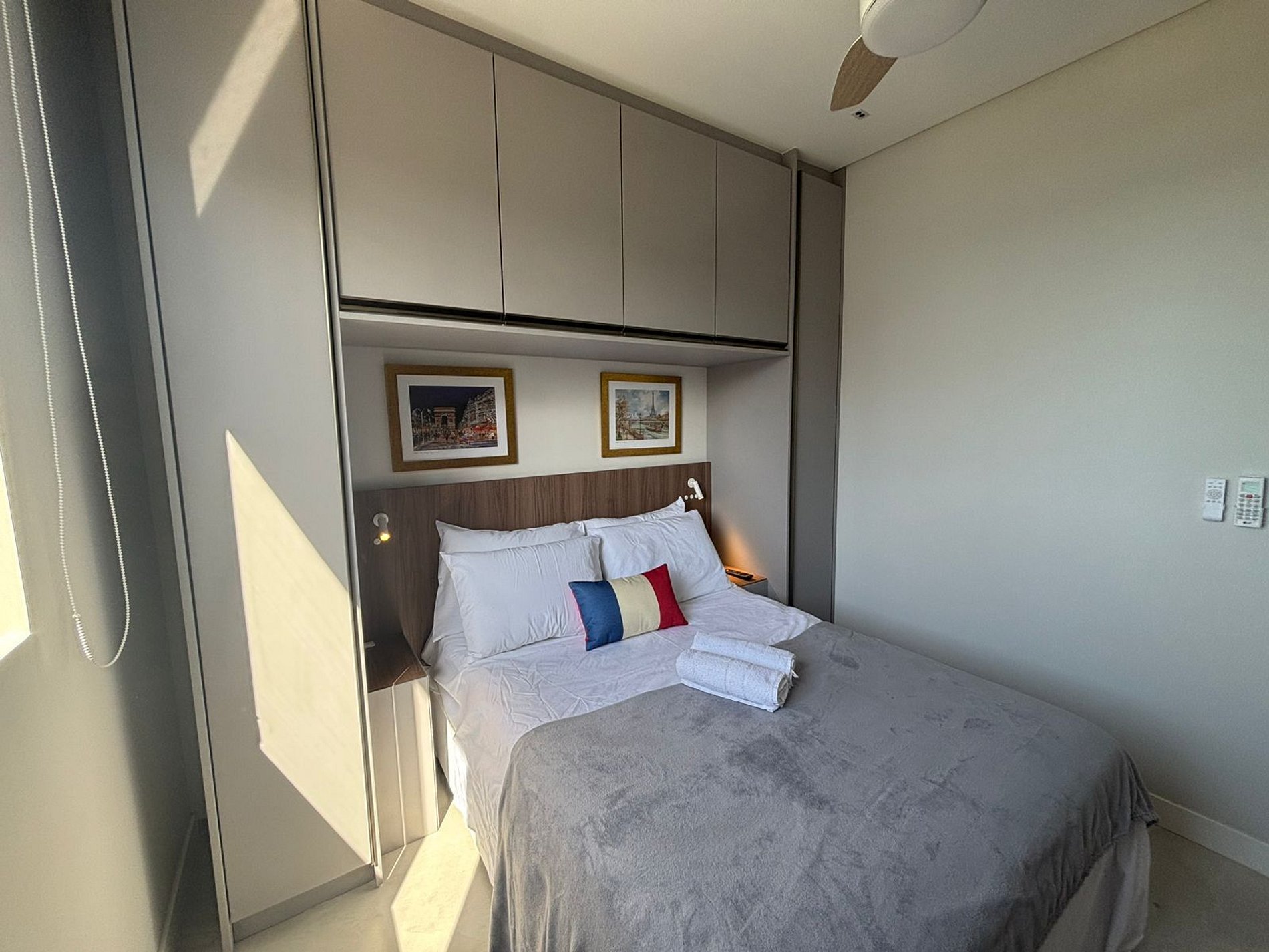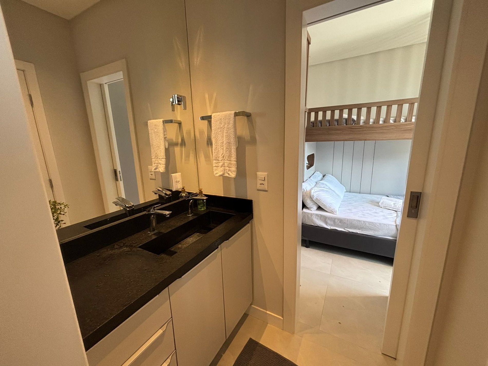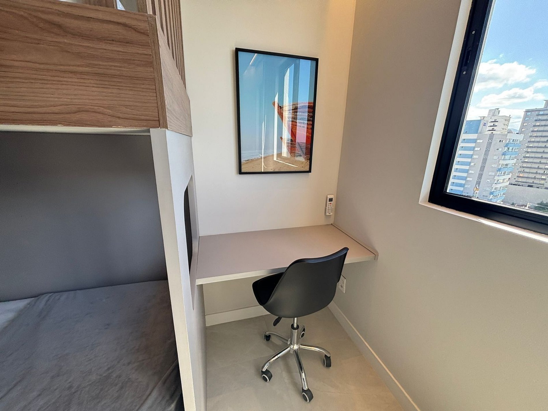 - 1 dormitorio con litera (cama tamaño viuda en la parte inferior y cama individual en la parte superior), armario, espacio para notebook y aire acondicionado;