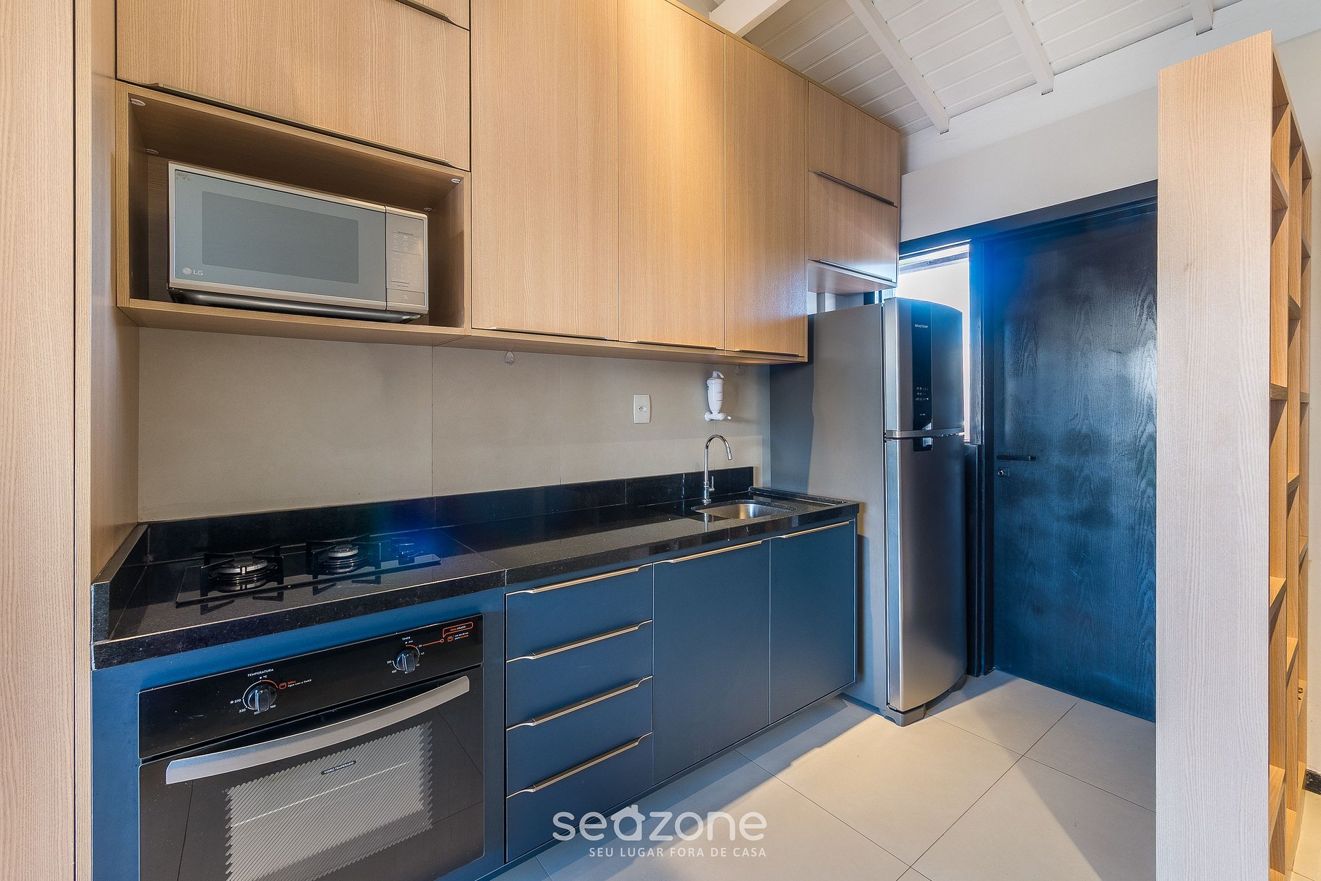 - Cocina completa con nevera, fogón cooktop y horno a gas, microondas, sandwichera, cafetera eléctrica, kit de café (soporte para filtro, termo para café), licuadora, copas de vino, ollas, vajilla y utensilios;