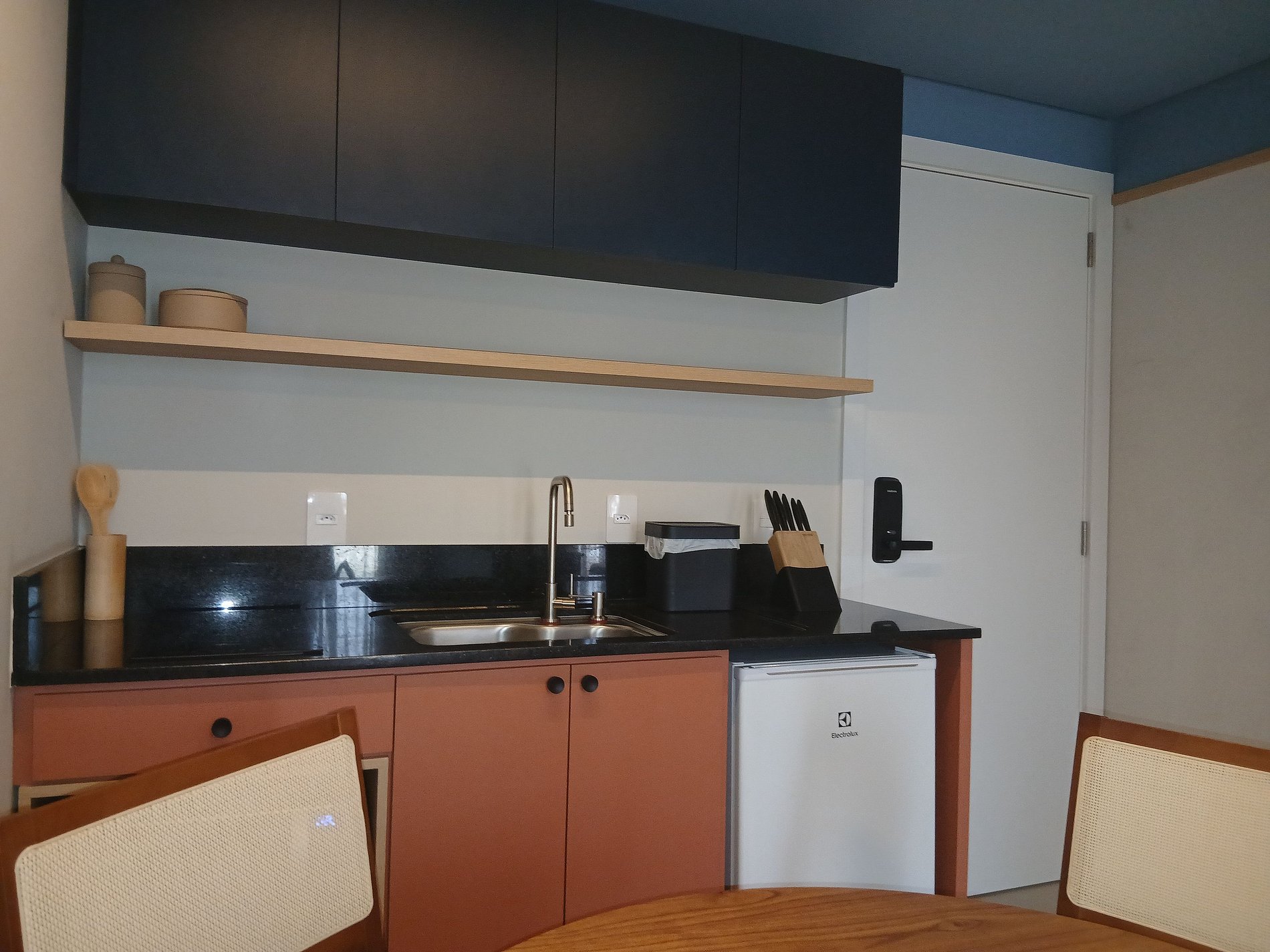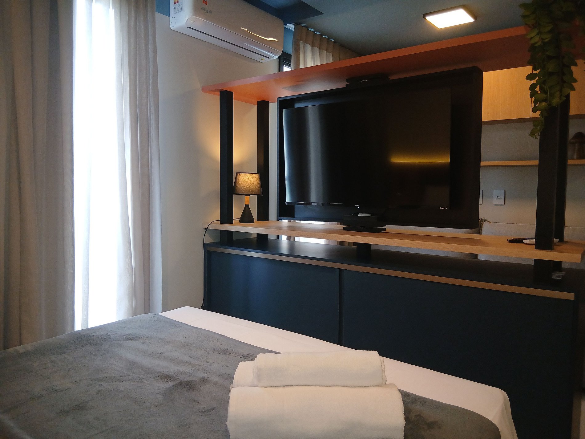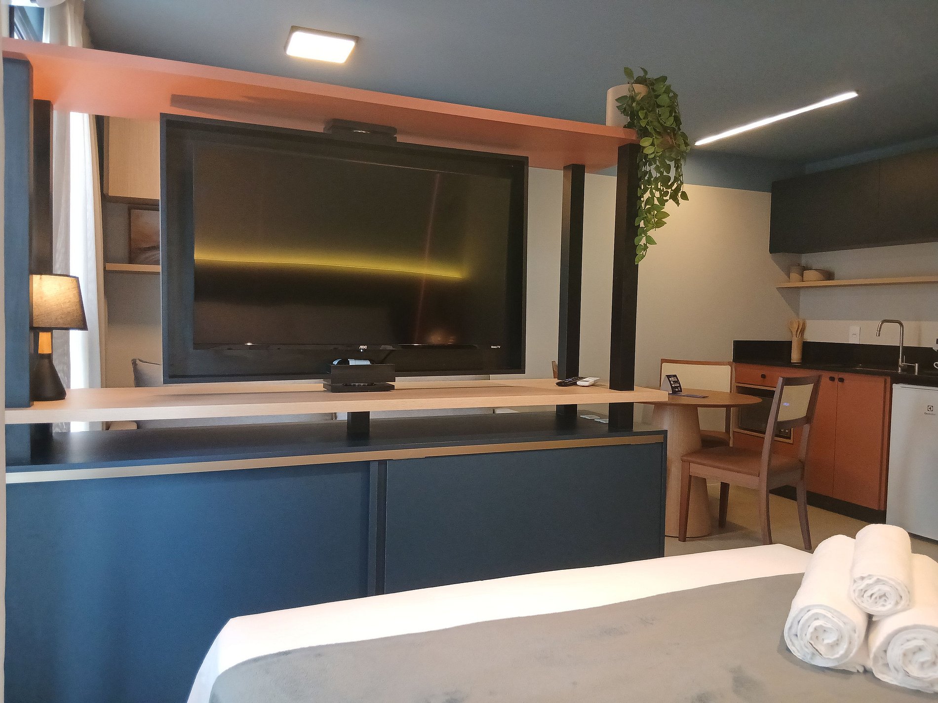 Con una distribución inteligente, este estudio cuenta con cama doble, sofá cama, Smart TV, wifi, aire acondicionado y cocina totalmente equipada. El balcón realza la sensación de bienestar. En la azotea, una piscina infinita y un espacio gourmet hacen que cada momento sea aún más especial. Cerca de las playas Rosa e Ibiraquera, la laguna y los atractivos naturales de la región.